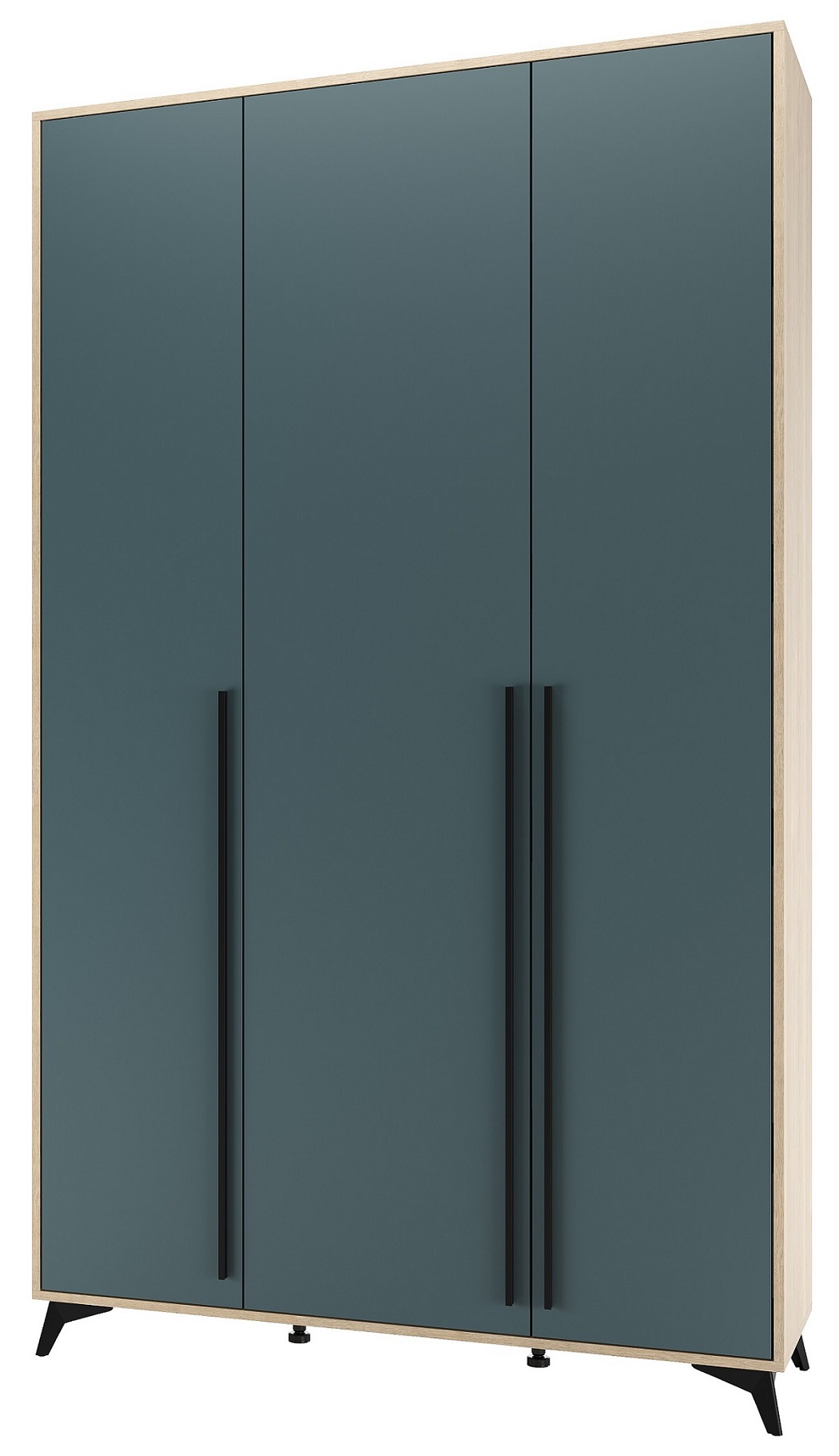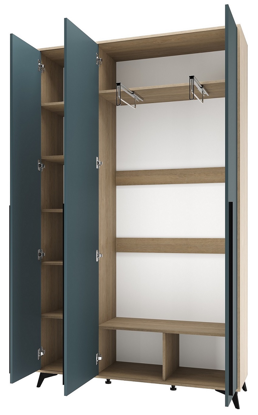 Шкаф 1300 3С «ЕВА» с выдвижными металлическими штангами, с полками. Фасады и лицевой периметр шкафа обработаны кромкой 1 мм. Чёрные металлические ручки-рейлинги и ножки-опоры