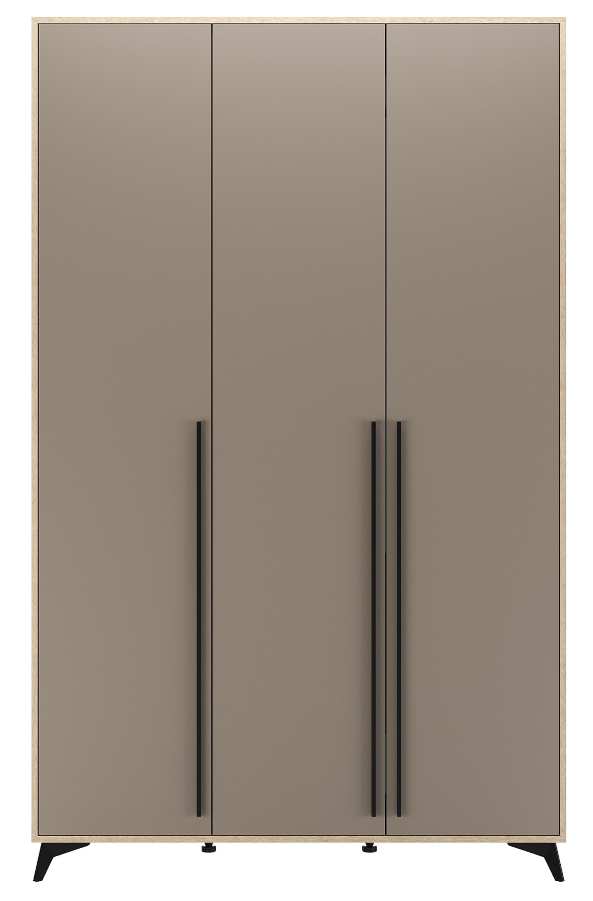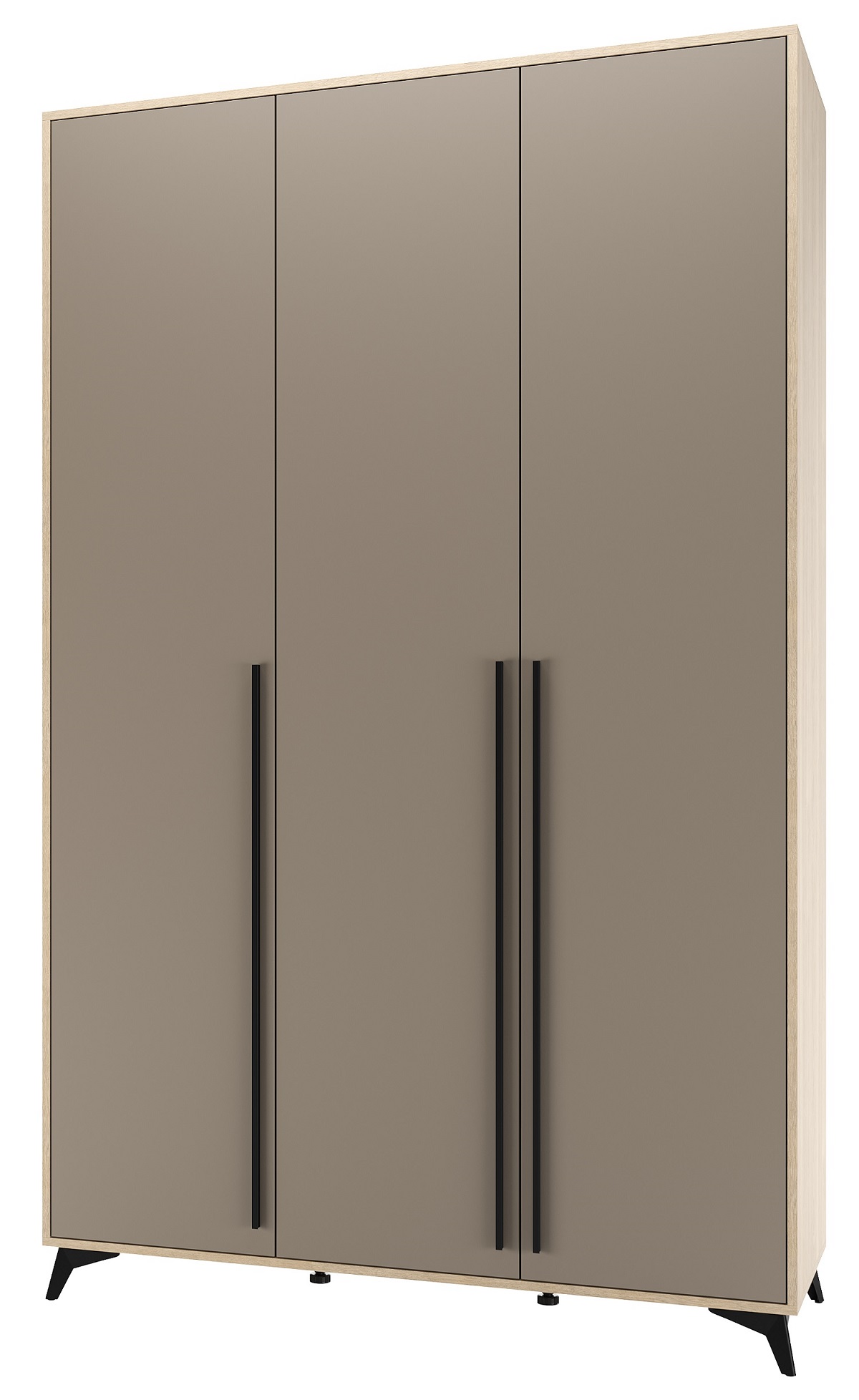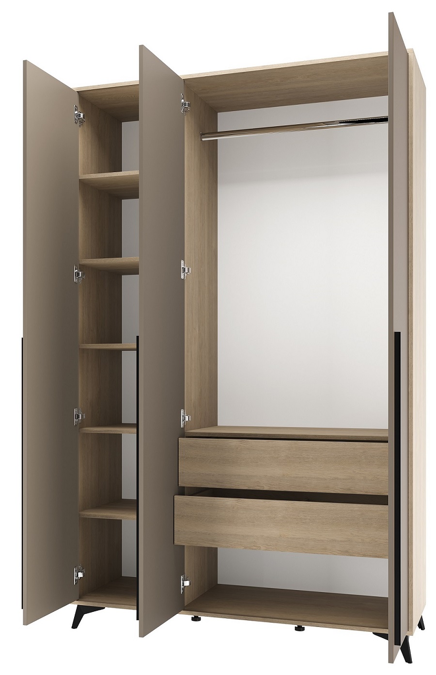 Шкаф 1360 3С2Я «ЕВА» с металлической штангой, полками и ящиками на направляющих скрытого монтажа с доводчиками. Фасады и лицевой периметр шкафа обработаны кромкой 1 мм. Чёрные металлические ручки-рейлинги и ножки-опоры.