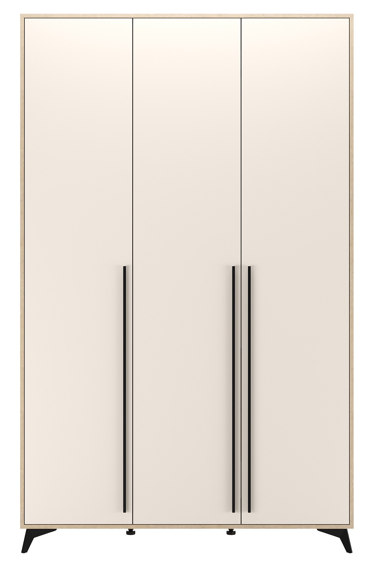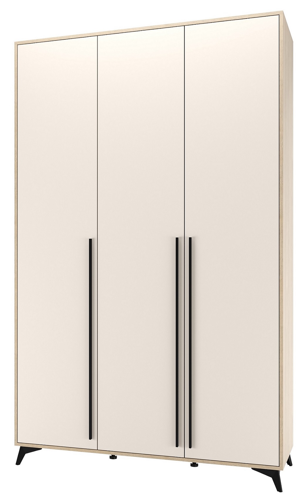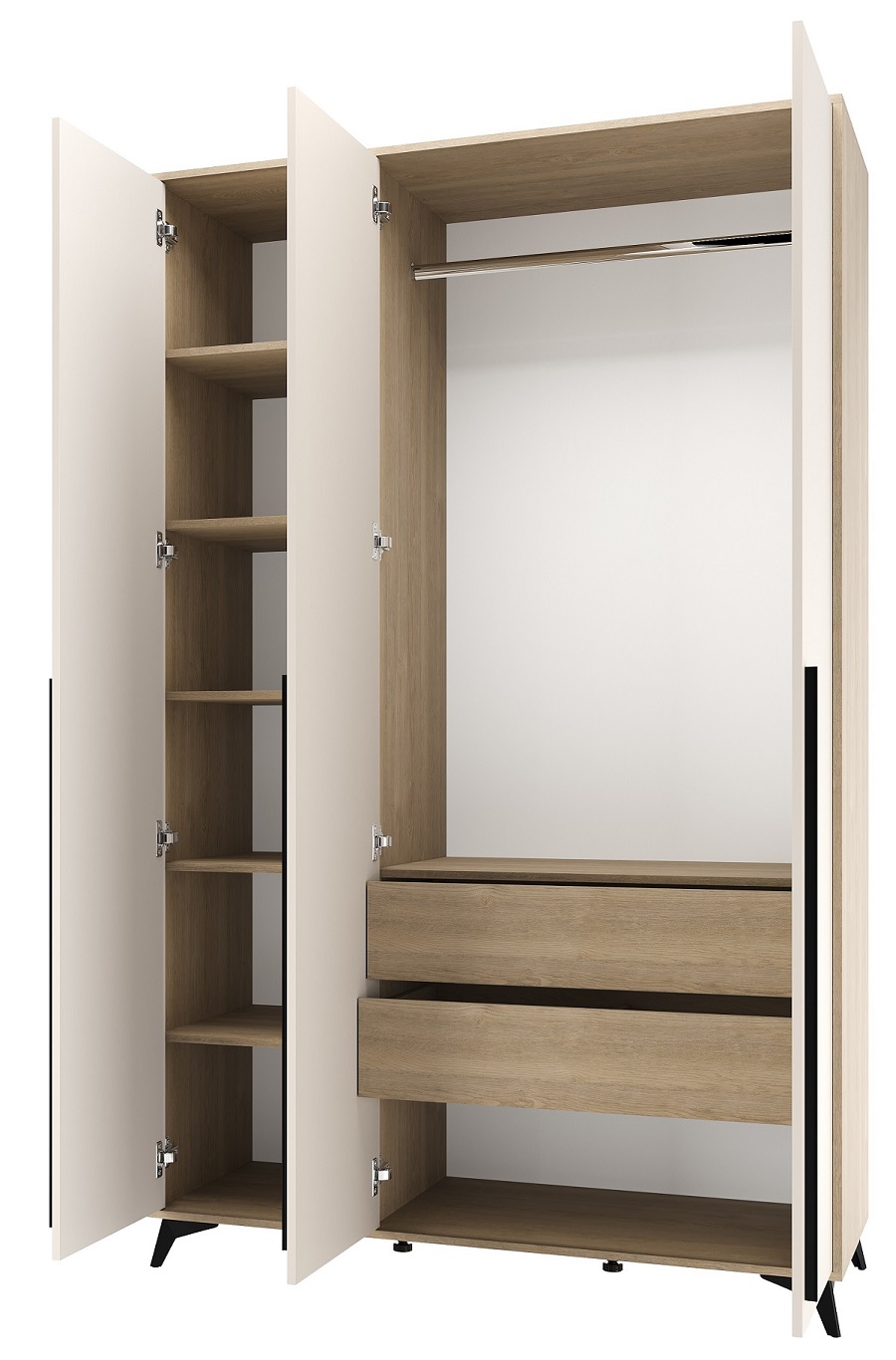 Шкаф 1360 3С2Я «ЕВА» с металлической штангой, полками и ящиками на направляющих скрытого монтажа с доводчиками. Фасады и лицевой периметр шкафа обработаны кромкой 1 мм. Чёрные металлические ручки-рейлинги и ножки-опоры.