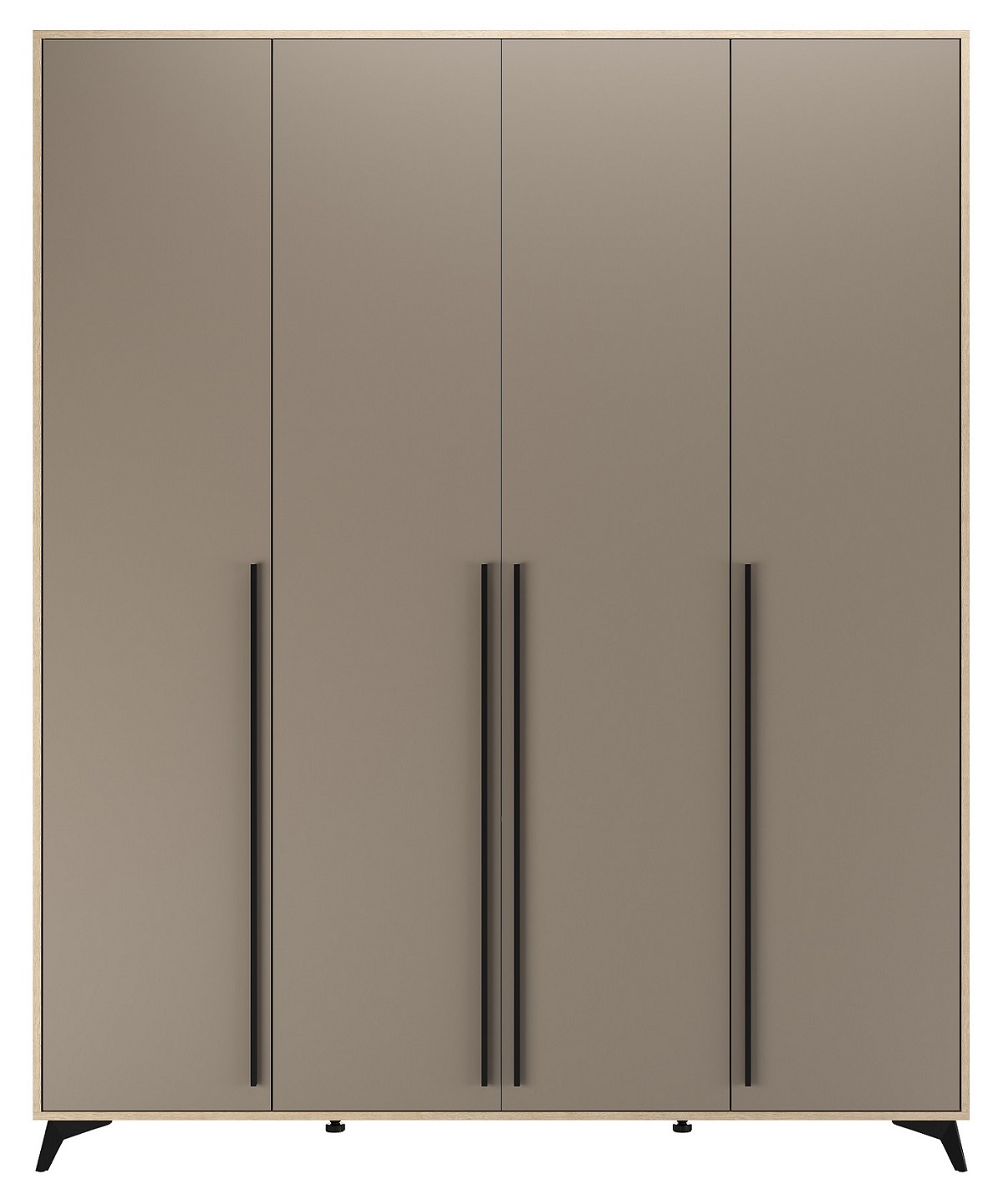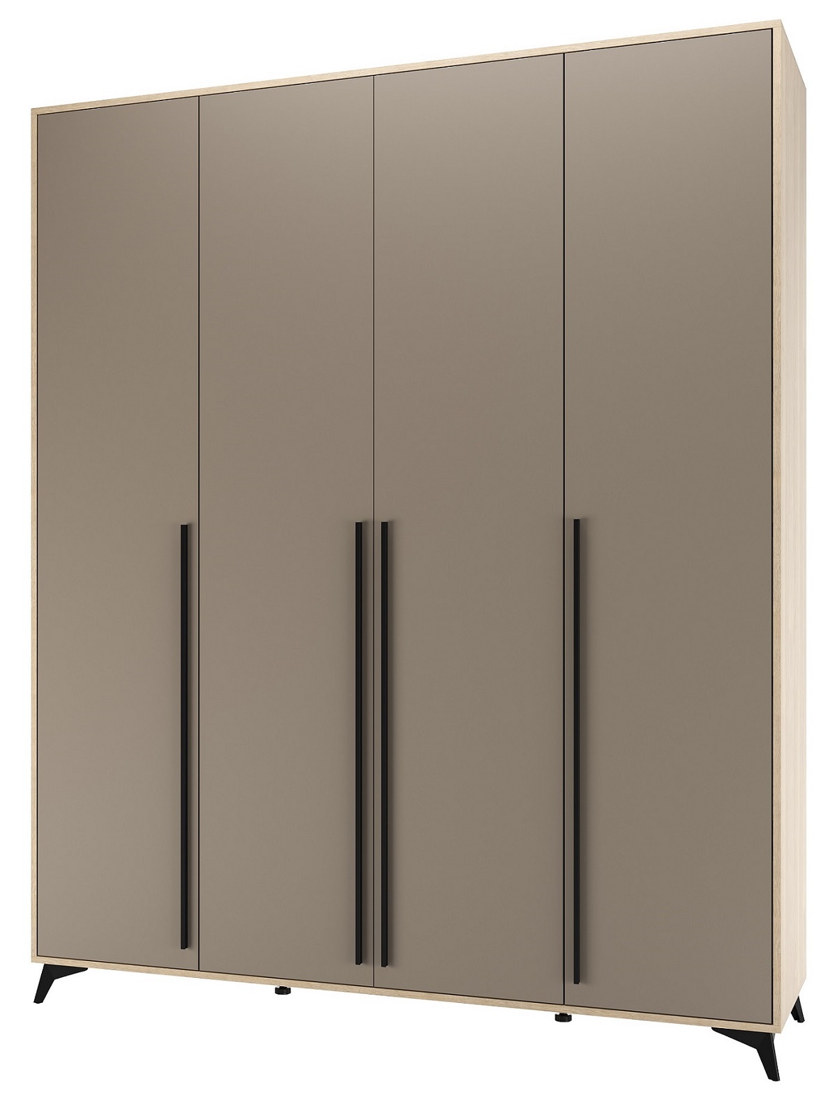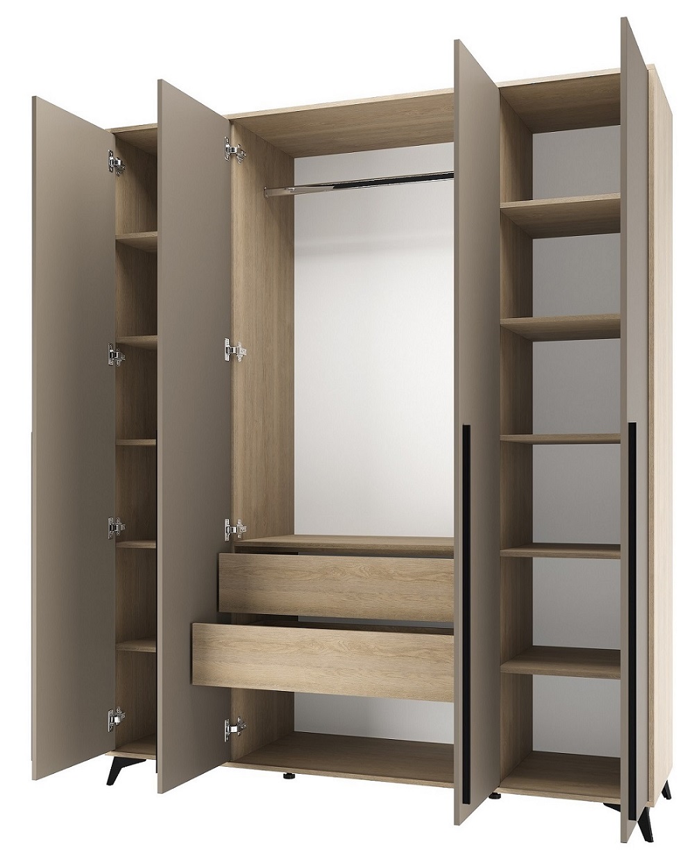 Шкаф 1800 4С2Я «ЕВА» с металлической штангой, полками и ящиками на направляющих скрытого монтажа с доводчиками. Фасады и лицевой периметр шкафа обработаны кромкой 1 мм. Чёрные металлические ручки-рейлинги и ножки-опоры.