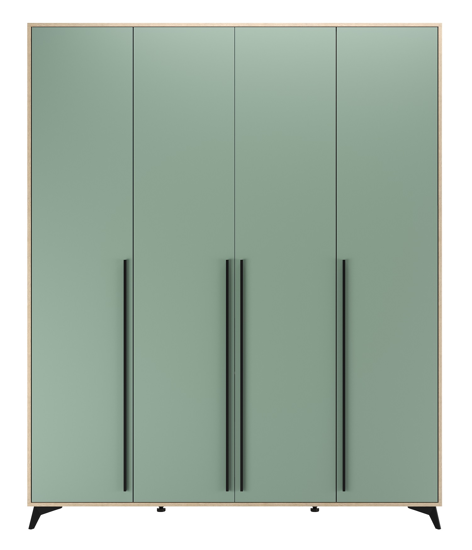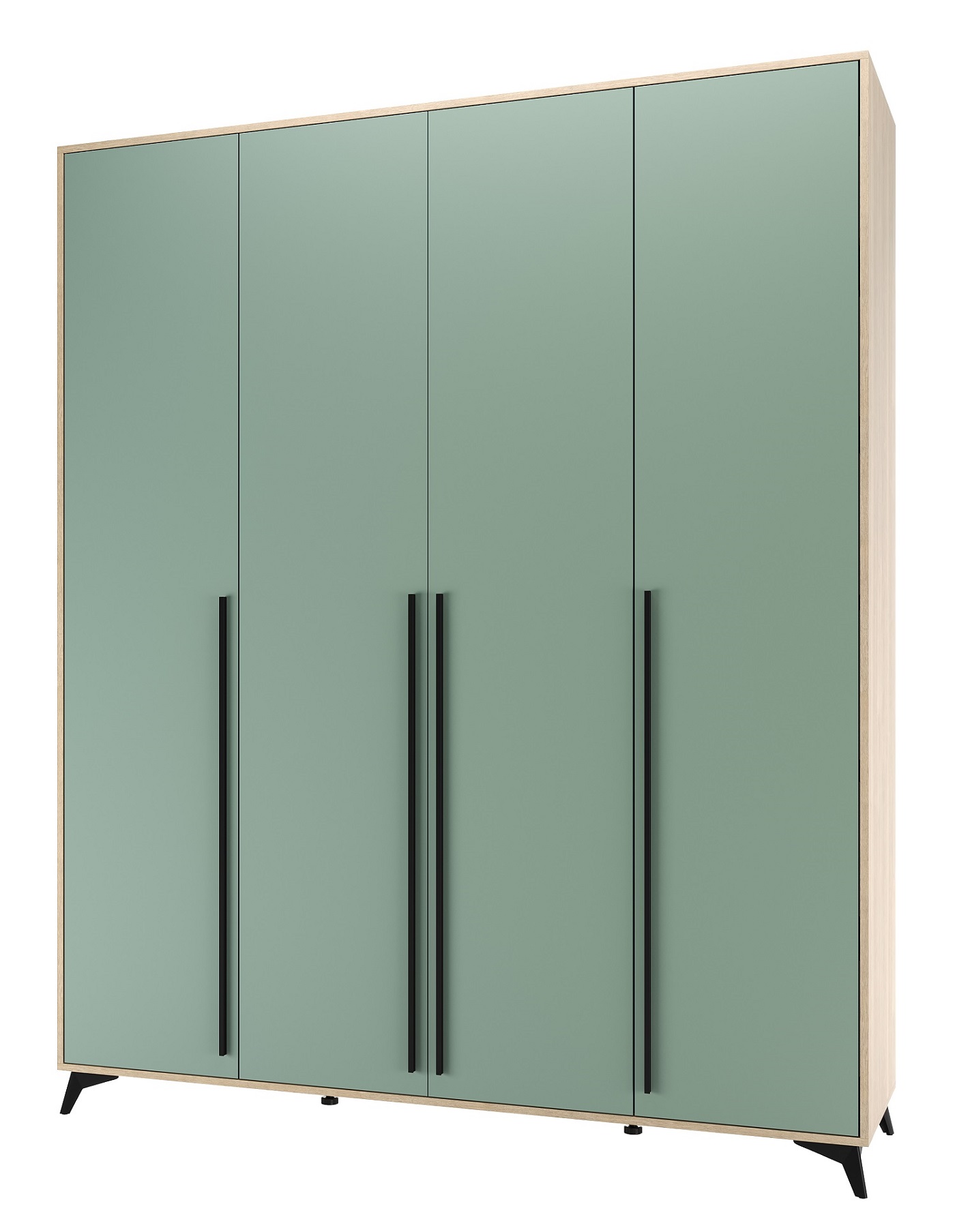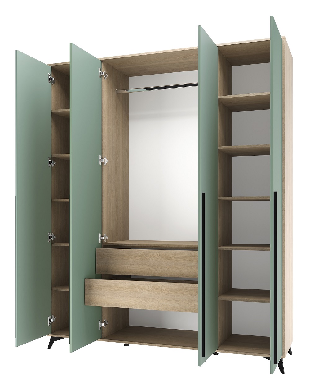 Шкаф 1800 4С2Я «ЕВА» с металлической штангой, полками и ящиками на направляющих скрытого монтажа с доводчиками. Фасады и лицевой периметр шкафа обработаны кромкой 1 мм. Чёрные металлические ручки-рейлинги и ножки-опоры.