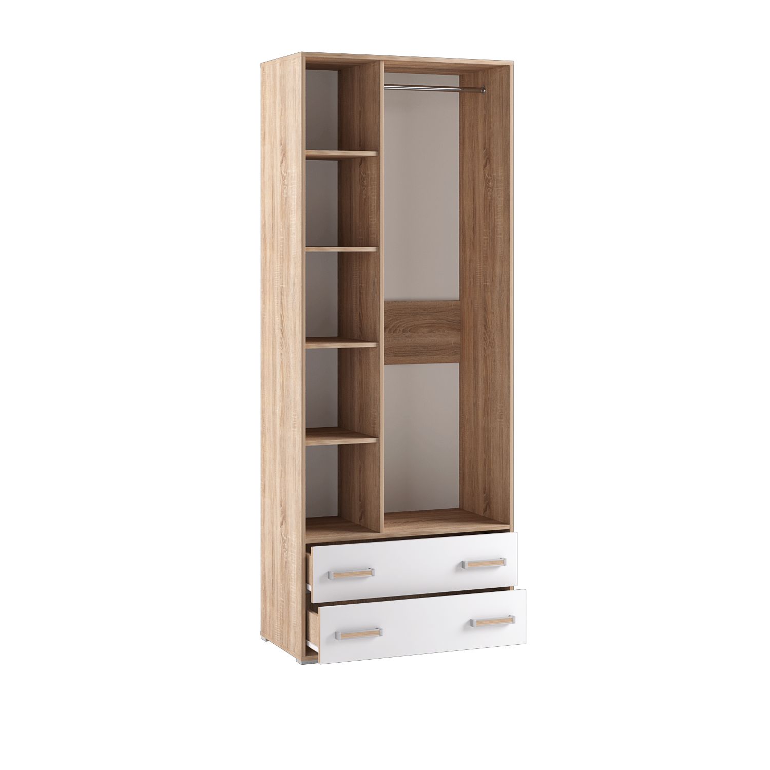 У двухдверного шкафа Бланка есть полки для белья, штанга для одежды, а также два выдвижных ящика, которые могут заменить комод,