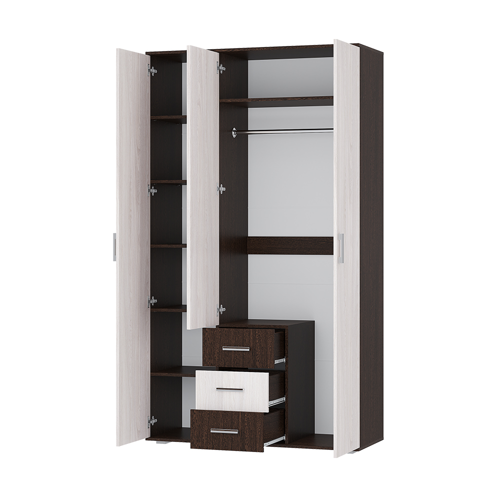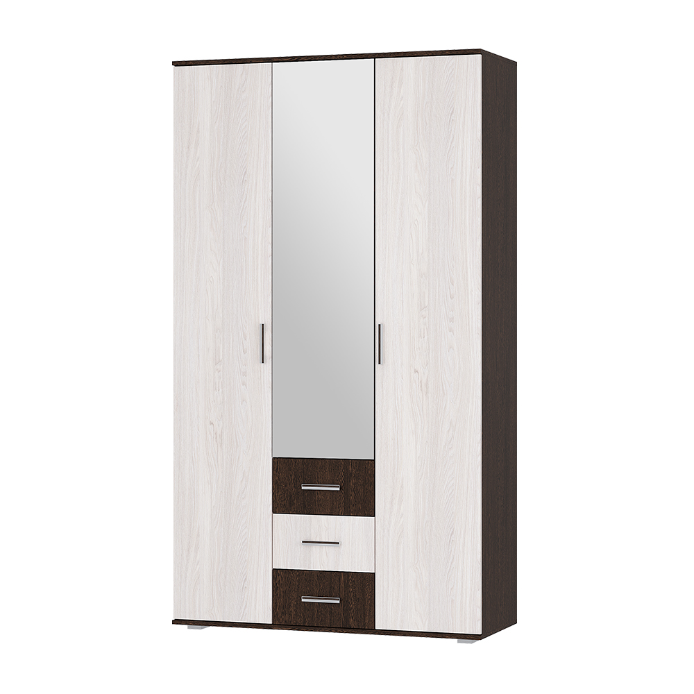 Трёхстворчатый шкаф «Белла» станет незаменимым помощником в хранении ваших вещей. Модель имеет отделение с хромированной штангой для одежды на вешалках, три выдвижных ящика, а также зону с полками. На центральный фасад прикреплено высокое зеркало.
