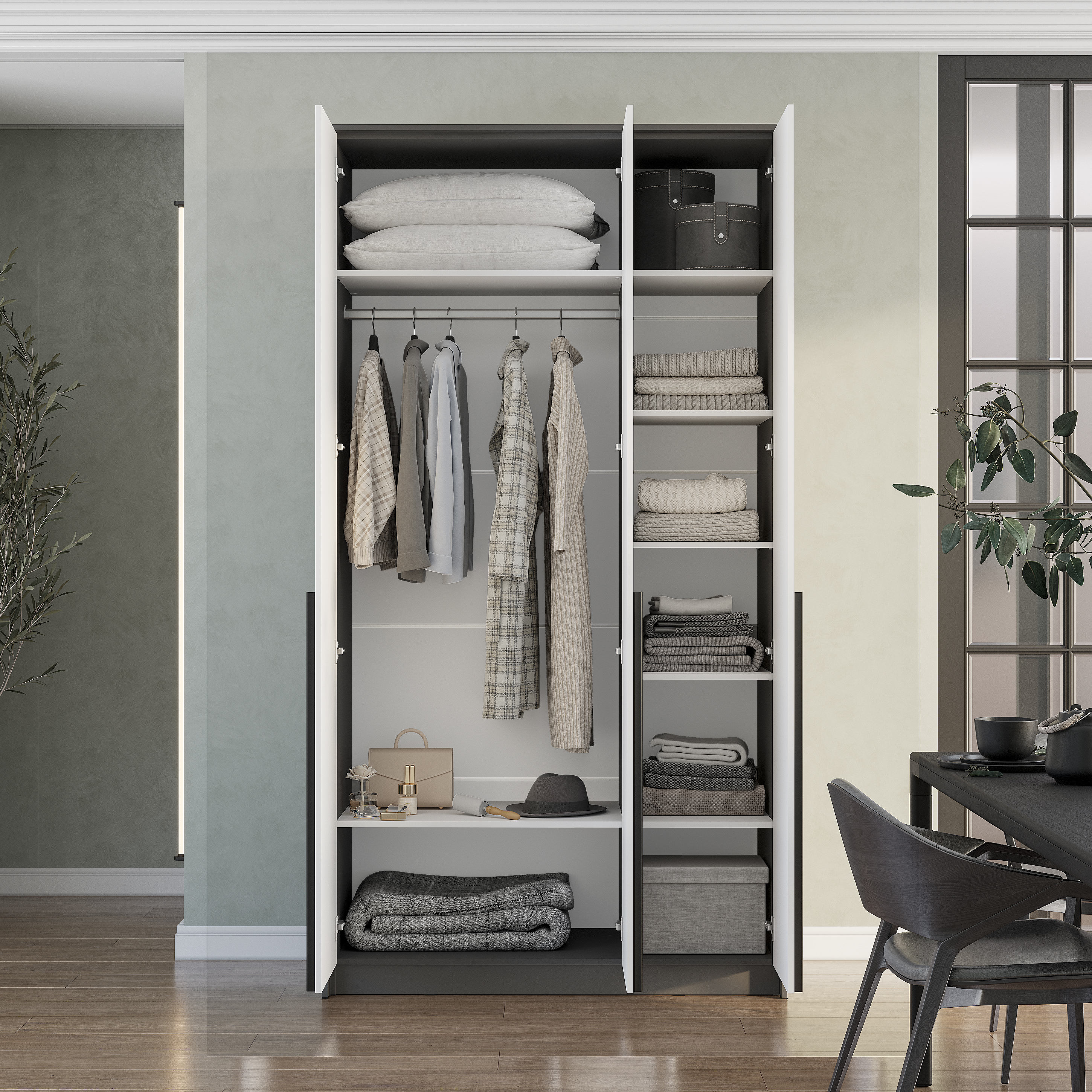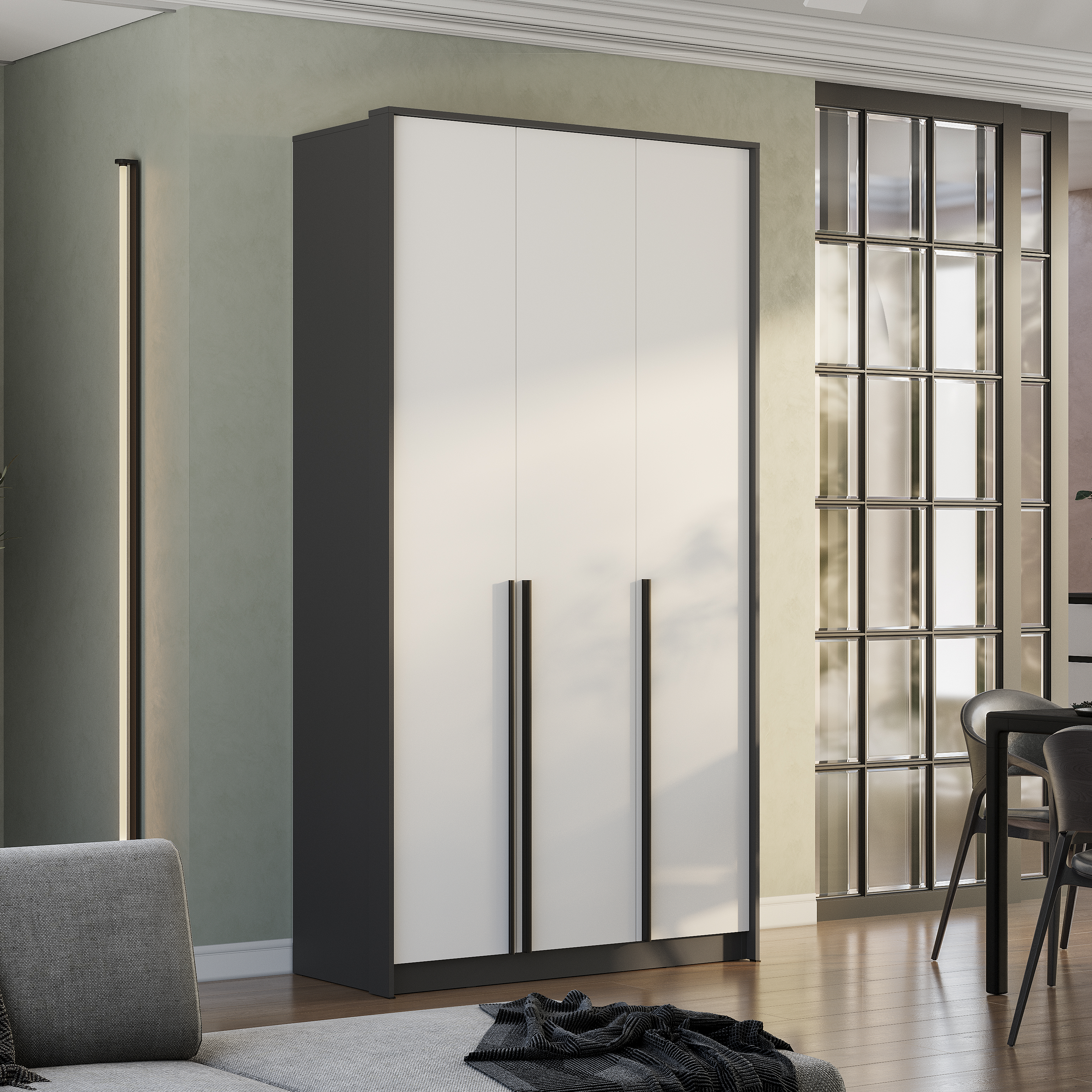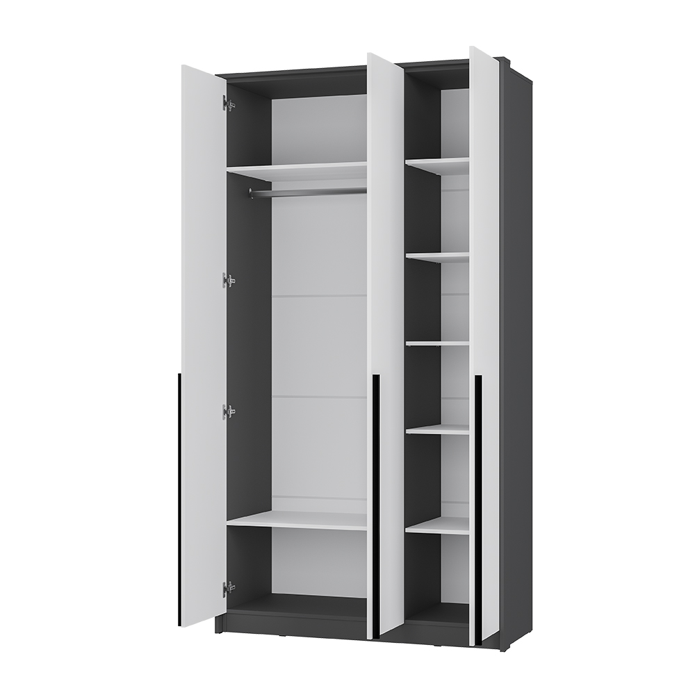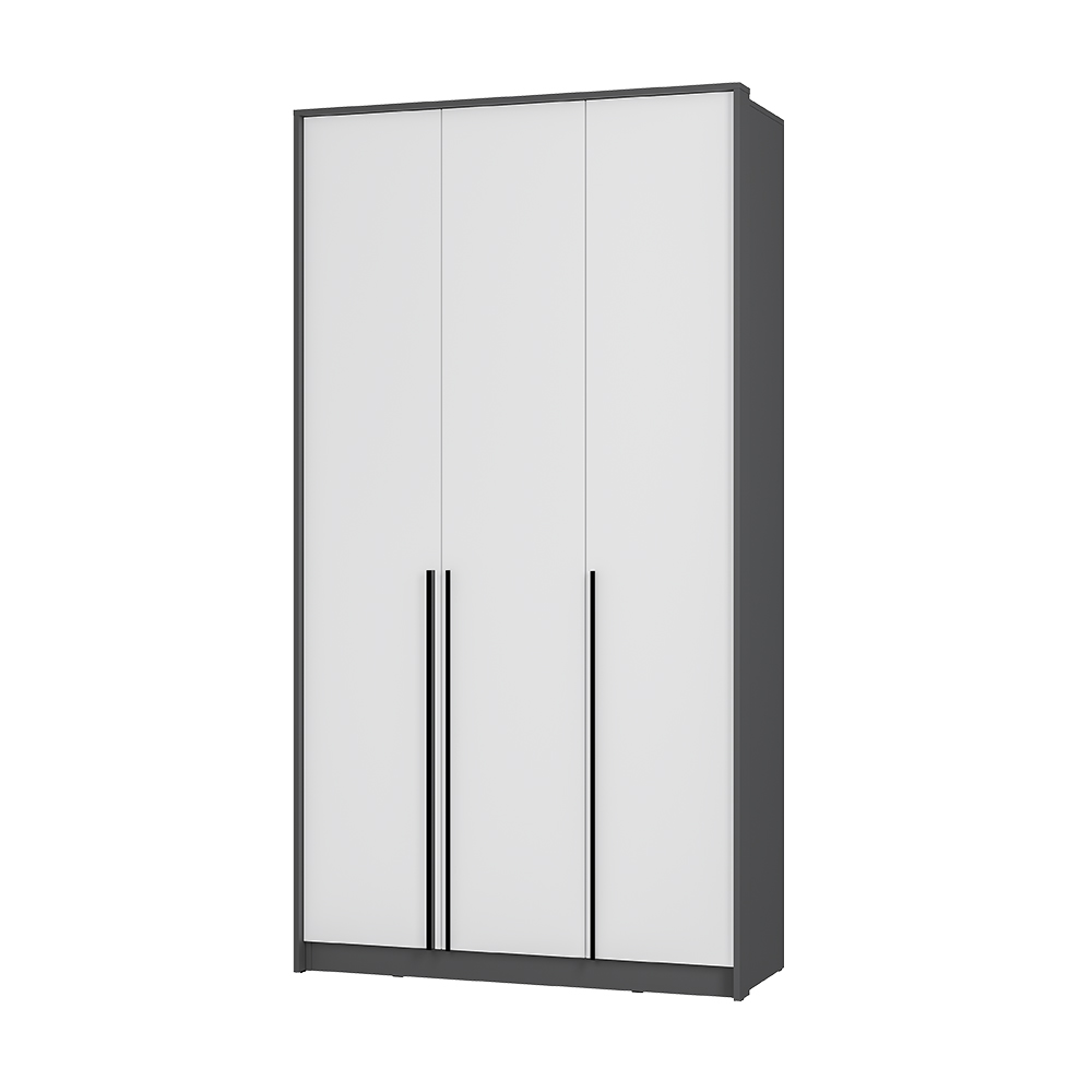 Коллекция «Шарм» - современная классика в контрастном исполнении «белый/графит». Шкаф обретает массивность благодаря монолитному ЛДСП - порталу, дополнен вертикальными черными ручками и надежными петлями с доводчиками.