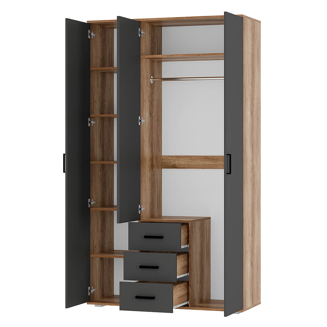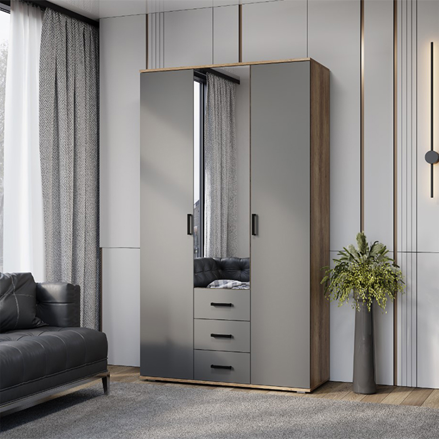 Шкаф 3-х створчатый «Вегас» ШК-08 - это вместительная и стильная модель для гостиной или личной комнаты. Модель состоит из двух зон: центральной — для вертикального хранения и вместительными ящиками и боковой — с шестью просторными полками. Стильная зеркальная дверца с еврокромкой добавит оригинальности вашему интерьеру.