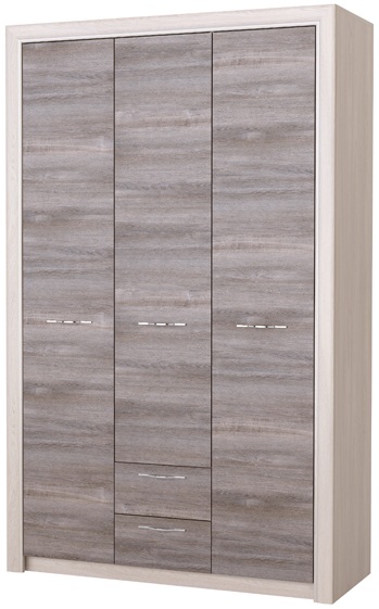 Шкаф 3С2Я «Октава» 3-створчатый с зеркалом и ящиками, с полками для белья и поперечной металлической штангой для верхней одежды. Устанавливается стильная металлическая ручка, декор «тёмный никель». Периметр шкафа обрамлён профилем MDF оригинальной формы с патиной (окраской фасок) серебристого цвета. Направляющие шариковые, полного выдвижения.