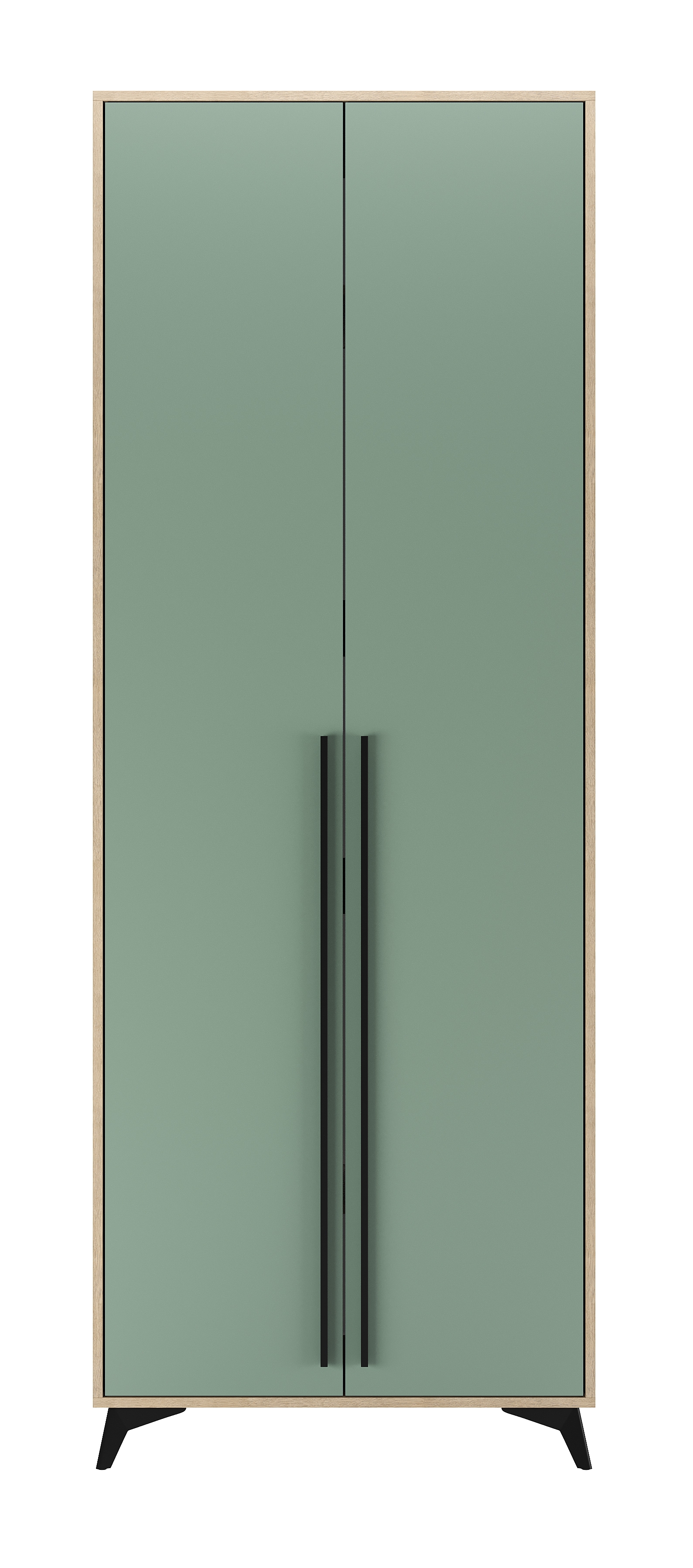 Шкаф 800 2С «ЕВА» с выдвижной металлической штангой. Фасады и лицевой периметр шкафа обработаны кромкой 1 мм. Чёрные металлические ручки-рейлинги и ножки-опоры.