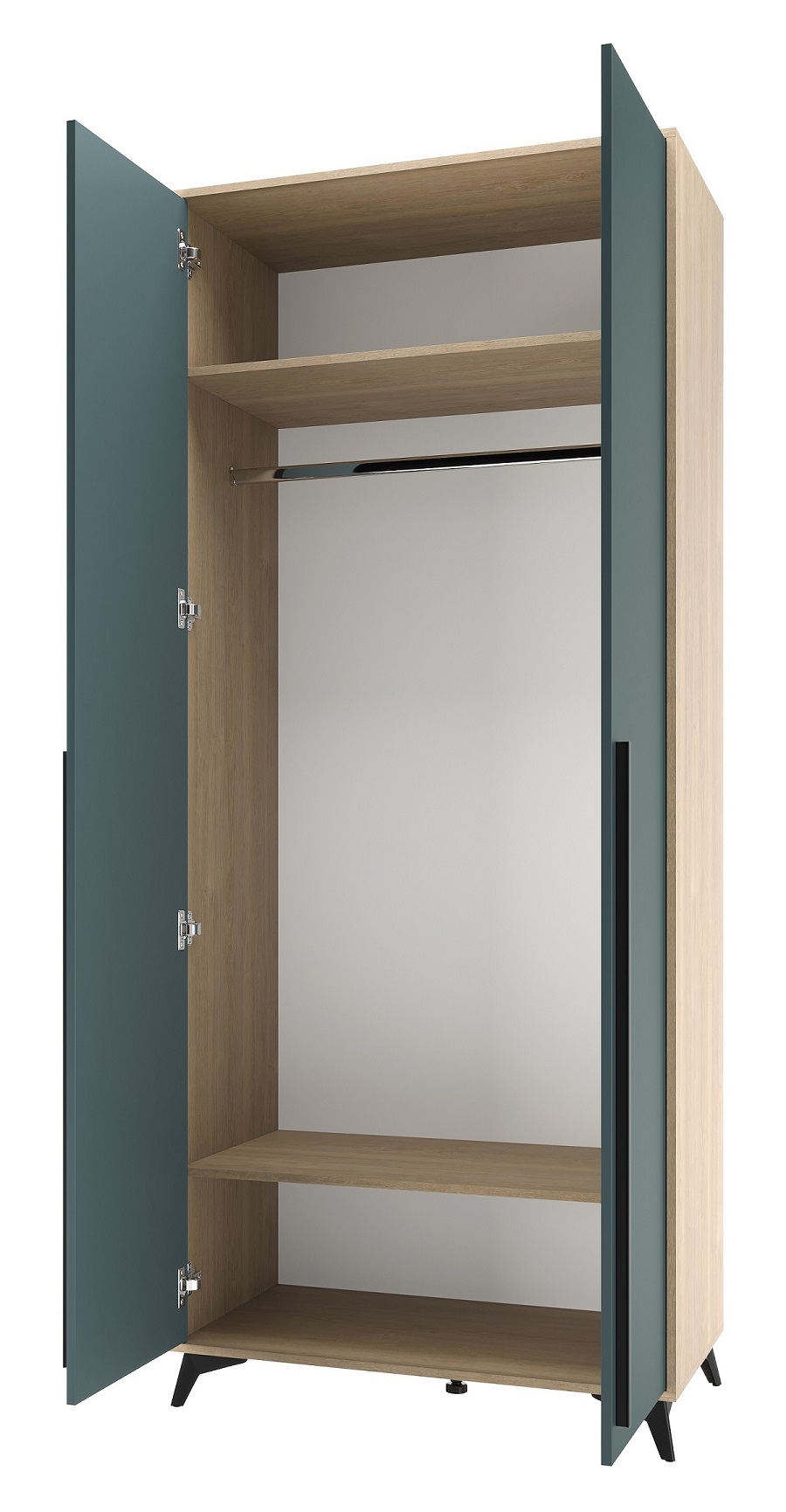 Шкаф 920 2С «ЕВА» с металлической штангой и полками. Фасады и лицевой периметр шкафа обработаны кромкой 1 мм. Чёрные металлические ручки-рейлинги и ножки-опоры.