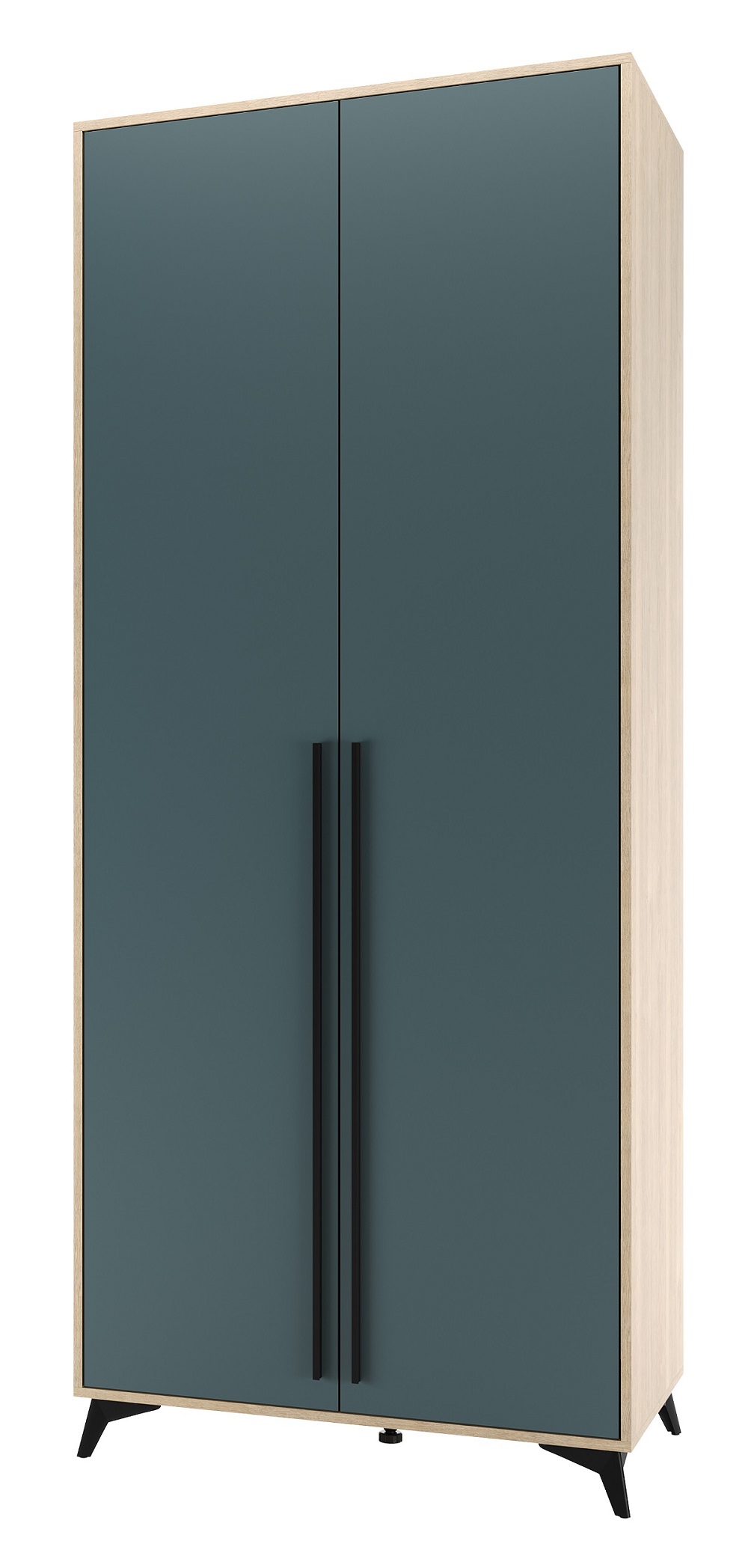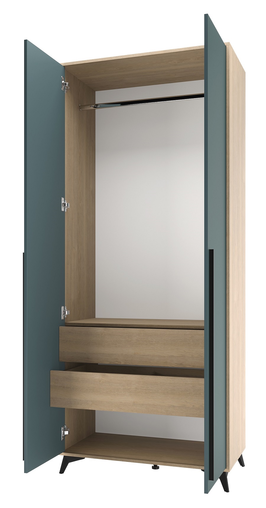 Шкаф 920 2С2Я «ЕВА» с металлической штангой и ящиками на направляющих скрытого монтажа с доводчиками. Фасады и лицевой периметр шкафа обработаны кромкой 1 мм. Чёрные металлические ручки-рейлинги и ножки-опоры.