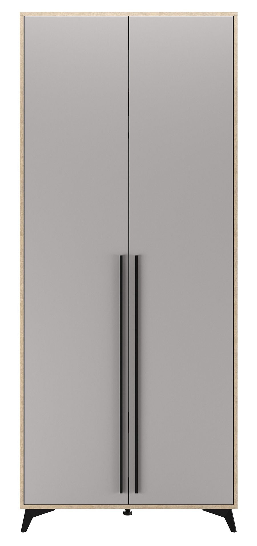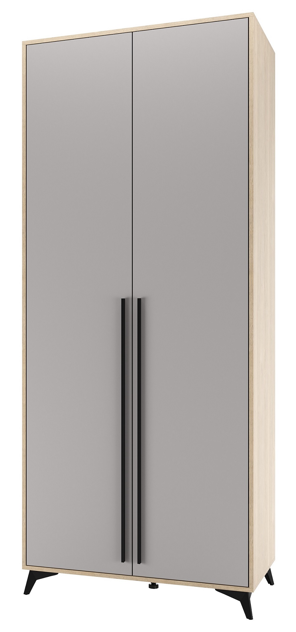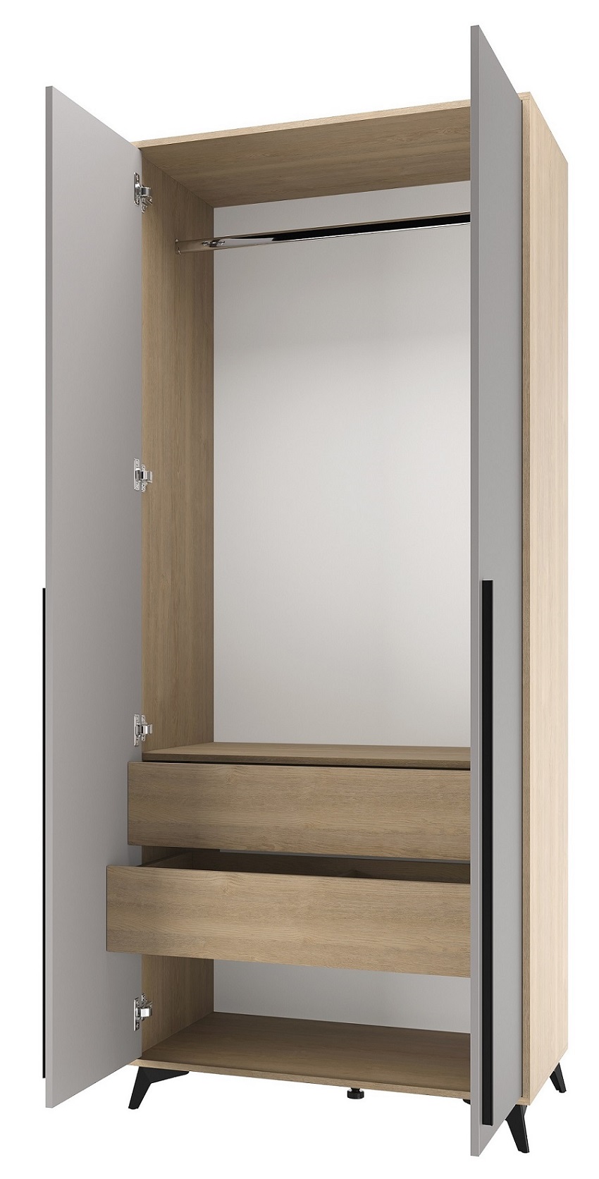 Шкаф 920 2С2Я «ЕВА» с металлической штангой и ящиками на направляющих скрытого монтажа с доводчиками. Фасады и лицевой периметр шкафа обработаны кромкой 1 мм. Чёрные металлические ручки-рейлинги и ножки-опоры.
