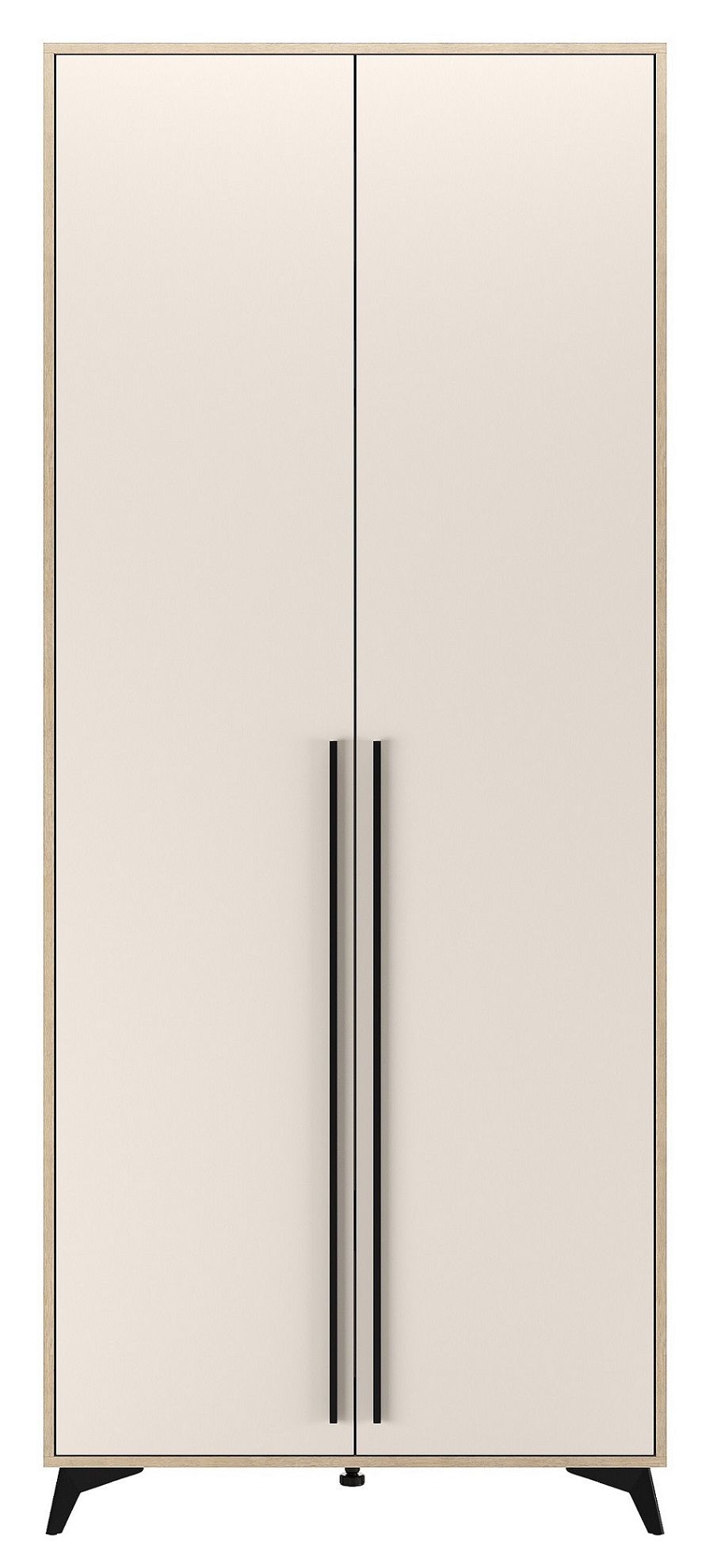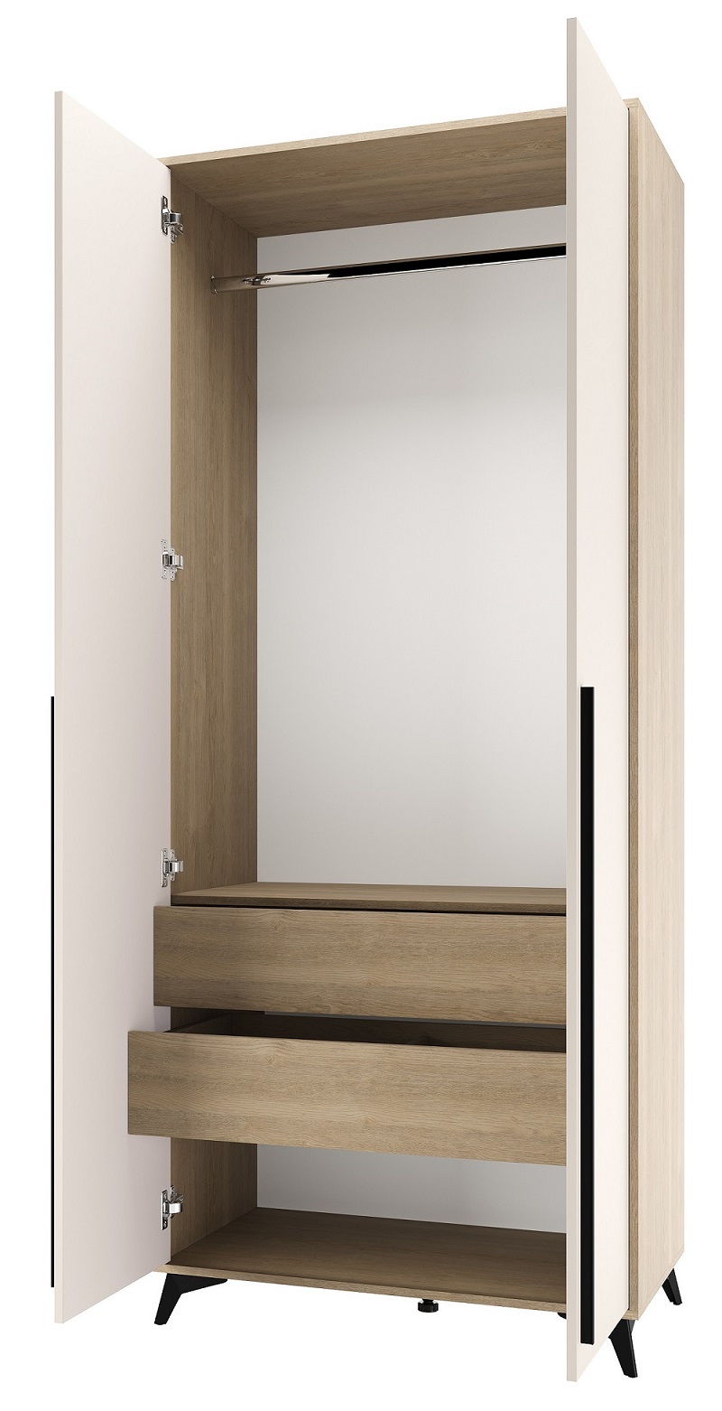Шкаф 920 2С2Я «ЕВА» с металлической штангой и ящиками на направляющих скрытого монтажа с доводчиками. Фасады и лицевой периметр шкафа обработаны кромкой 1 мм. Чёрные металлические ручки-рейлинги и ножки-опоры.