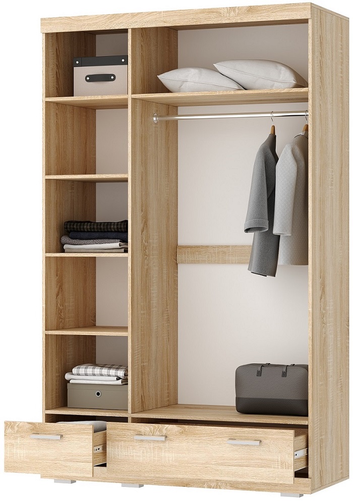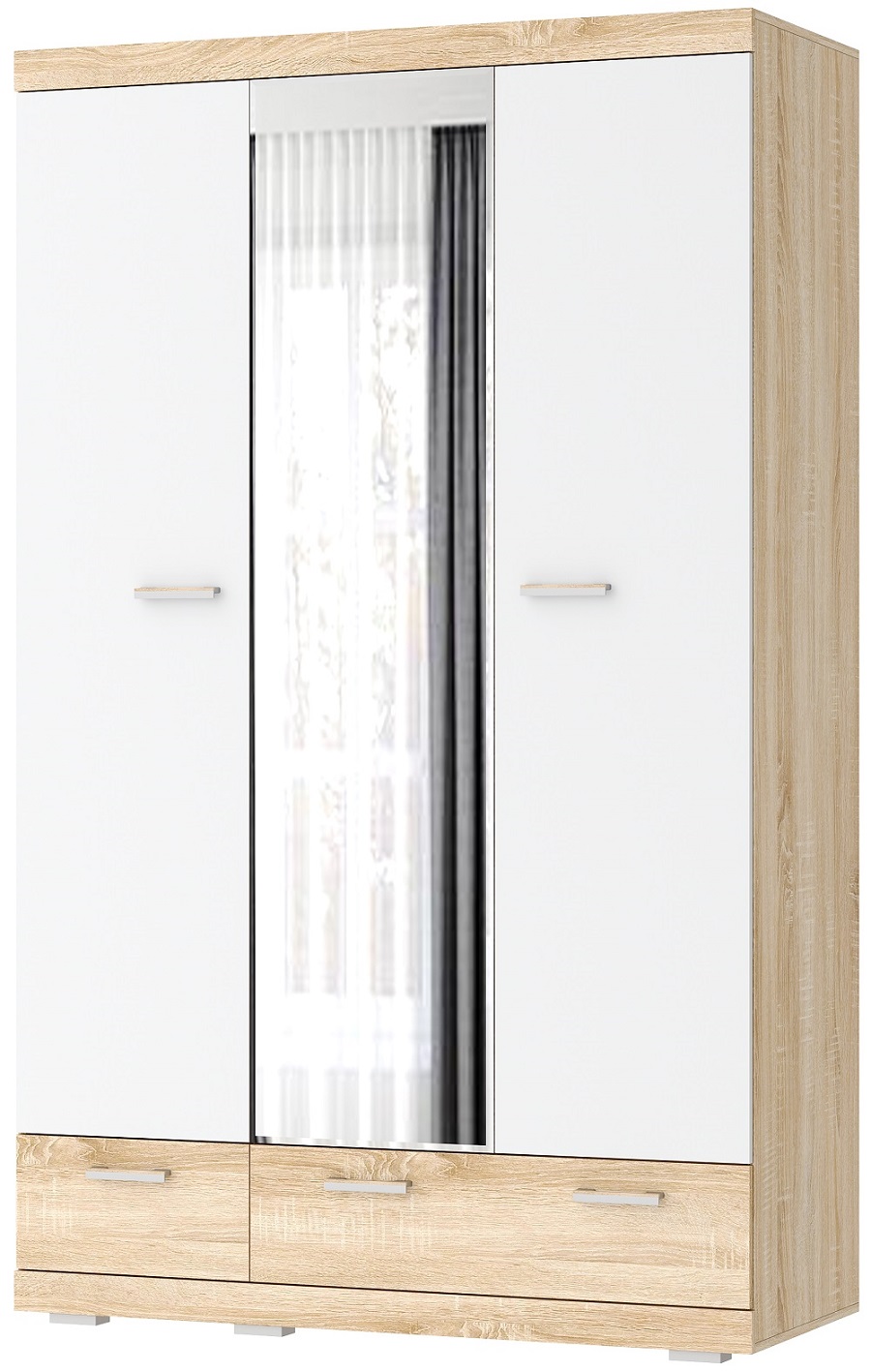 Шкаф «СОНАТА» ШСЗ-1350 трёхстворчатый с зеркалом, с полками, металлической штангой штангой для верхней одежды и двумя ящиками на направляющих полного выдвижения. Верхняя и нижняя части шкафа обрамлёны профилем MDF. Зеркало выполнено с изящной и красивой обработкой «фацет» по периметру.