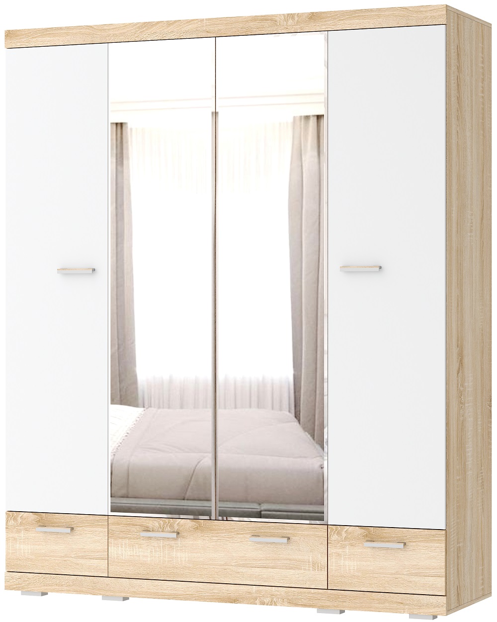 Шкаф «СОНАТА» ШСЗ-1800 четырёхстворчатый с зеркалами, с полками, металлической штангой штангой для верхней одежды и тремя ящиками на направляющих полного выдвижения. Верхняя и нижняя части шкафа обрамлёны профилем MDF. Зеркала выполнены с изящной и красивой обработкой «фацет» по периметру.