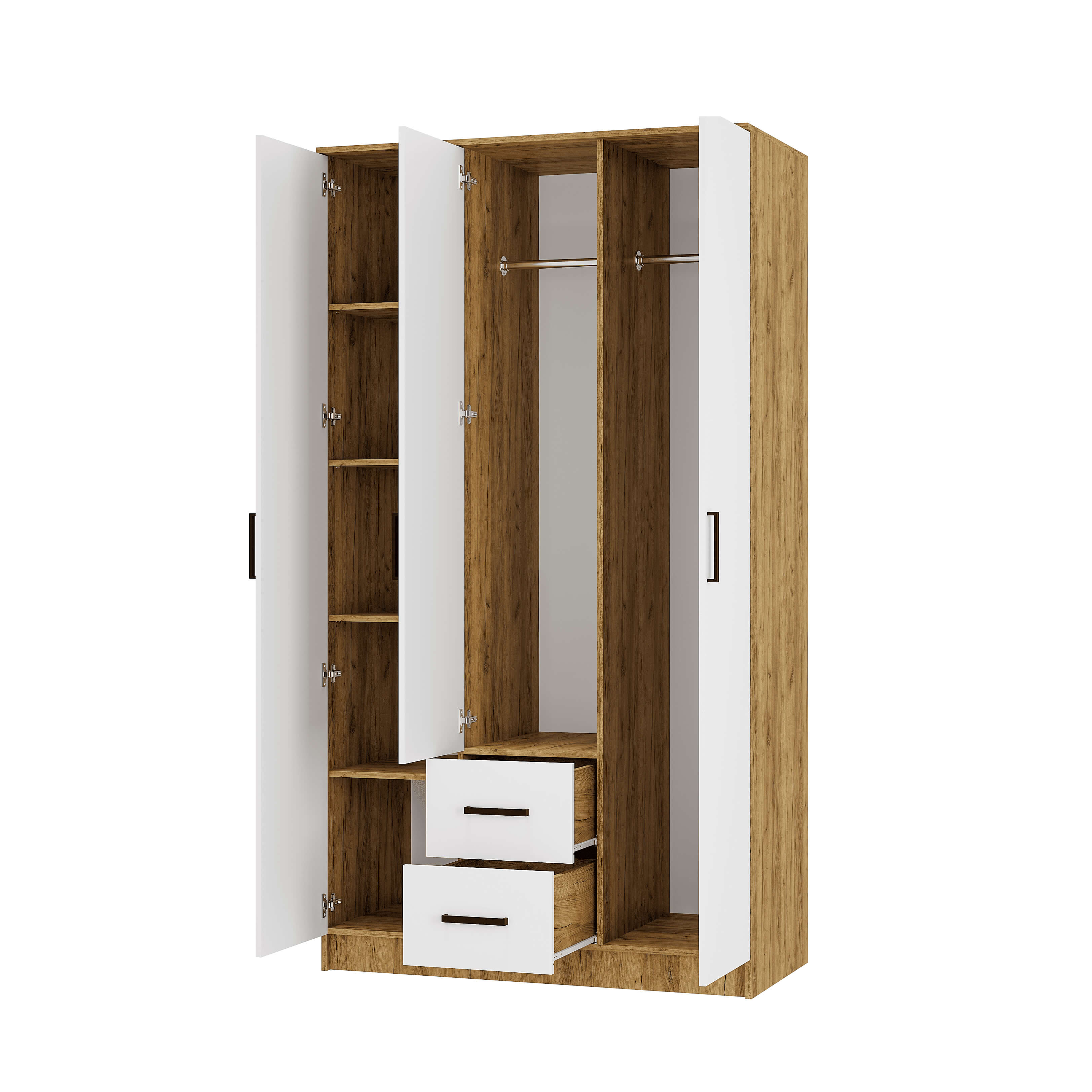 Шкаф трехстворчатый «Евро» ШК-06 - ваш стильный и удобный спутник в организации пространства. Он состоит из двух отделений со штангой, отделения с полками и двух выдвижных ящиков на роликовых направляющих.