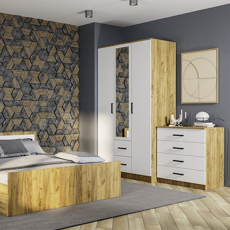 Модульная спальня «Евро», выполненная в современном стиле, придаст вашей комнате образ идеального и гармоничного пространства, отразив характер и вкусовые предпочтения хозяина. Приветливая и спокойная атмосфера, подаренная этой коллекцией, позволит почувствовать себя окруженным домашним уютом сразу же, как только вы в нее попадете. Продуманные до мелочей детали придадут эстетическую утонченность интерьеру, позволив забыть о городской суете. Коллекция выполнена в комбинации белого и цвета «крафт». Геометрические ручки очень удобны в использовании.