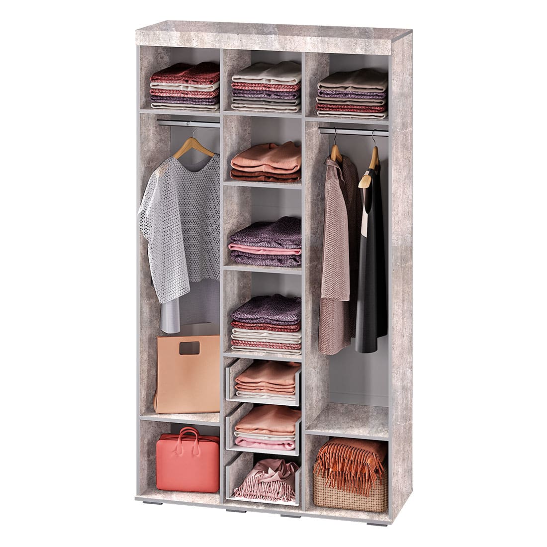 внутреннее наполнение состоит из отделения со штангой, полок для вещей и трех выдвижных ящиков на роликовых направляющих;