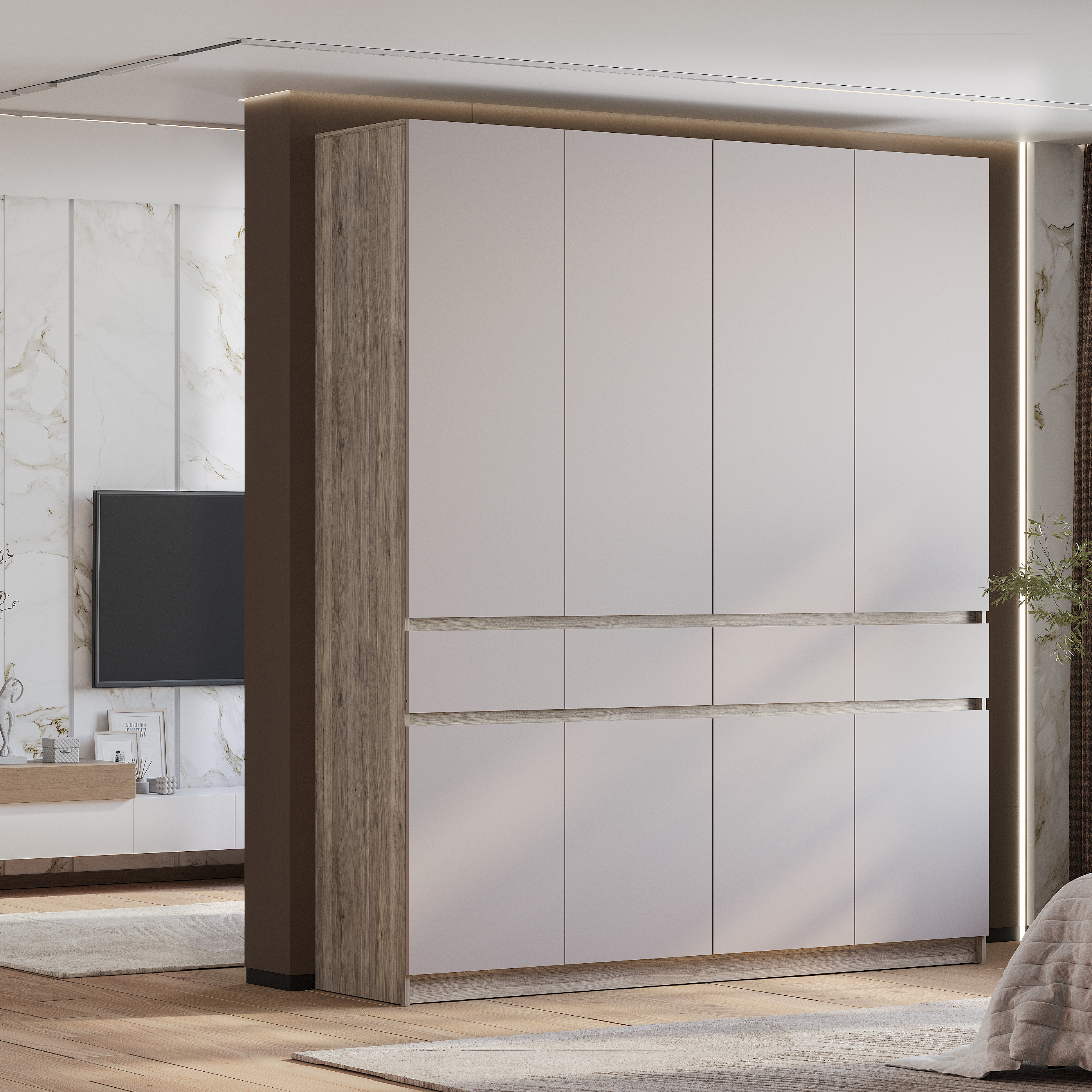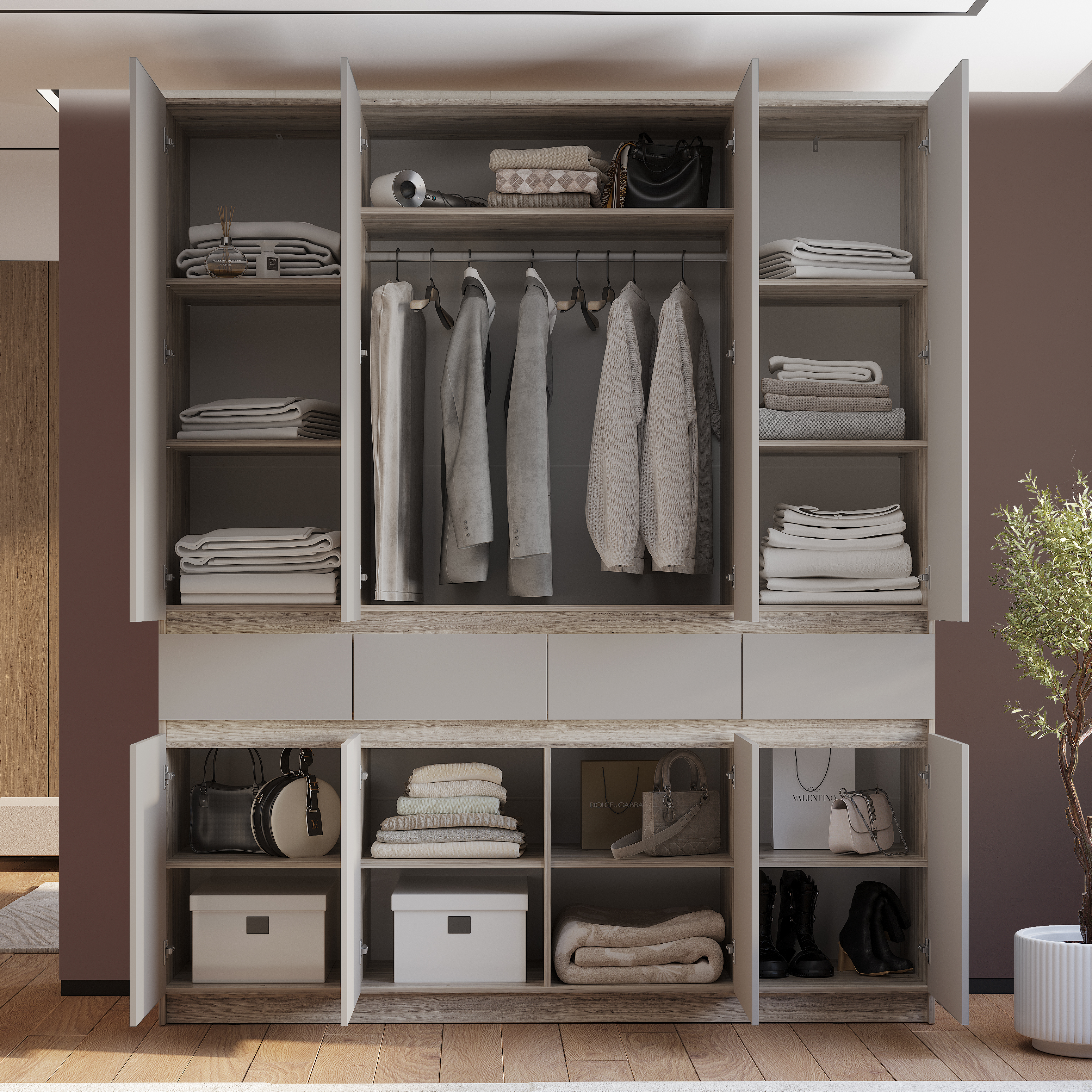Шкаф 4-х створчатый «Багира» ШК-13 - это стиль, универсальность и вместительность. Хромированная штанга для аккуратного вертикального хранения одежды.