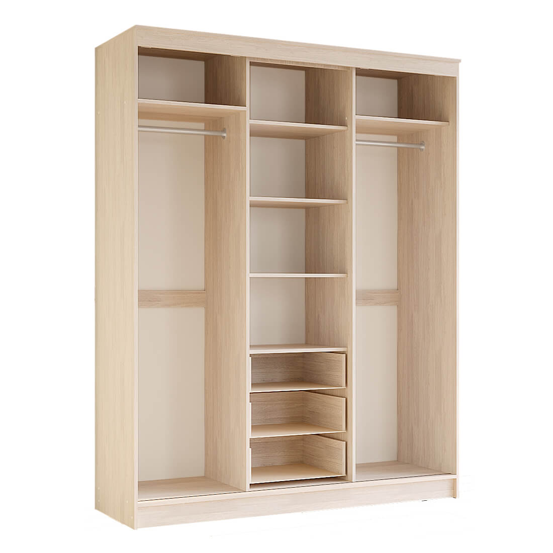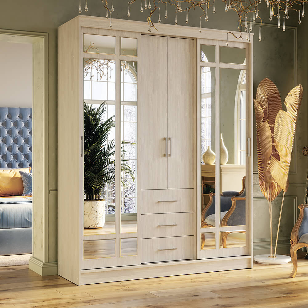 Функциональный и компактный шкаф-купе Маэстро порадует своего нового обладателя новым трендовым цветовым решением. Завораживающий декор фасада в виде зеркал с фацетной обработкой придает дополнительный шарм этой модели. Используемый раздвижной механизм премиум-класса соответствует современным тенденциям. Многочисленные полки, два платяных отделения и комод позволяют свободно разместить одежду в шкафу.