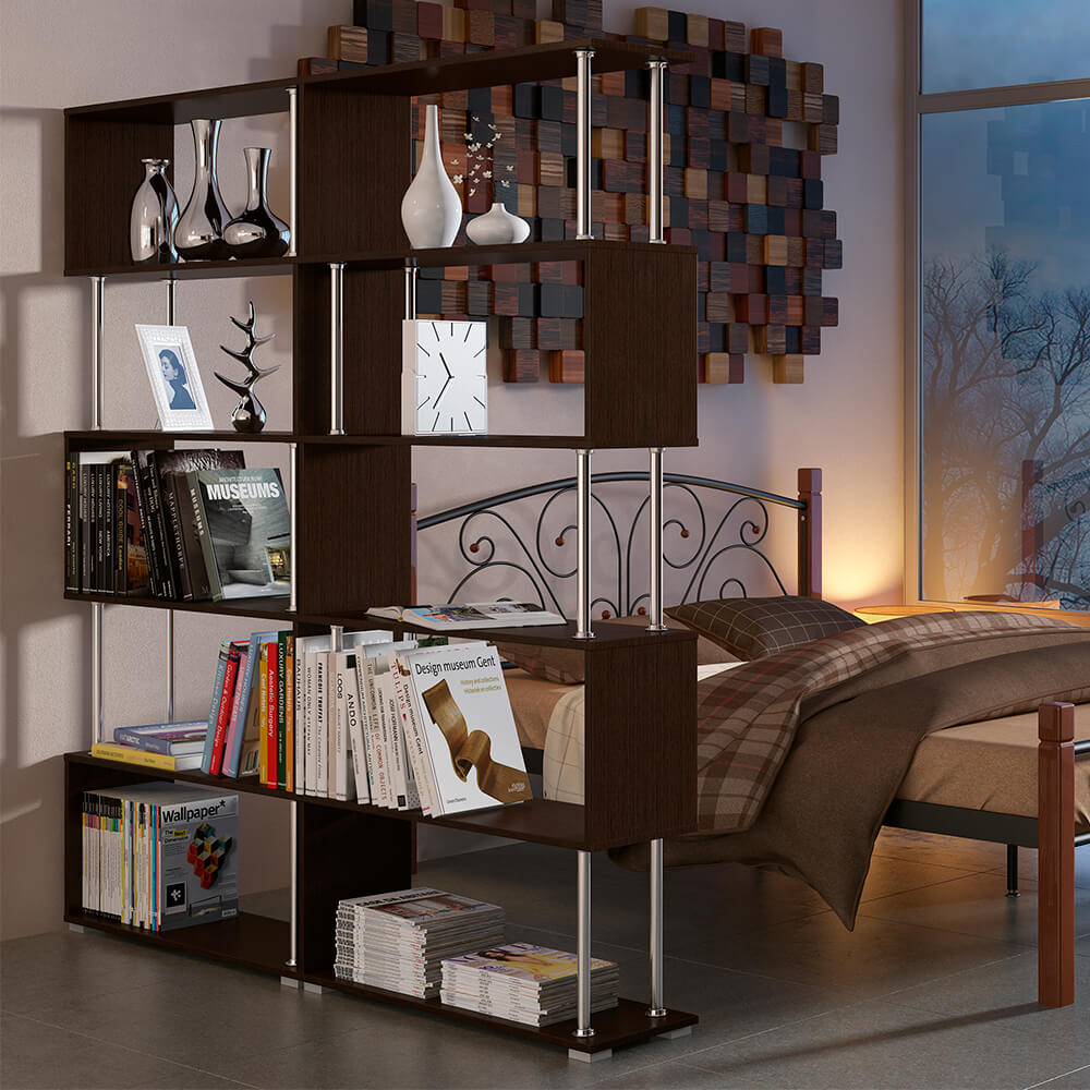 Стеллаж 850 – очень вместительный и при этом визуально легкий предмет интерьера. На нем вы можете разместить все необходимые вещи, включая книги, предметы декора, домашние цветы или фотографии. Невесомости основным полкам стеллажа, выполненным в темном цвете венге, придают хромированные штанги.