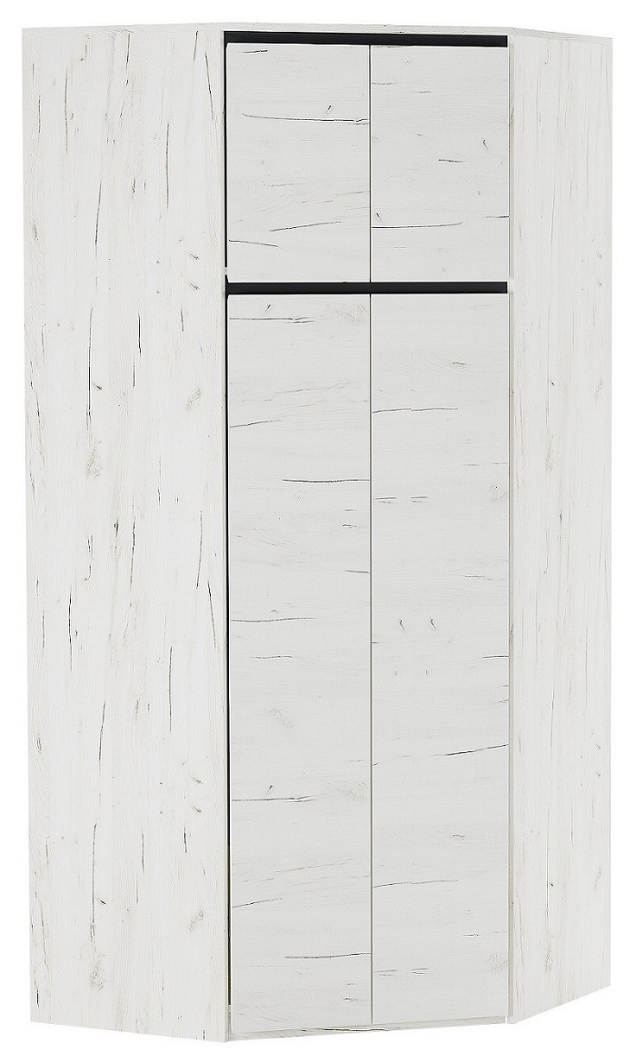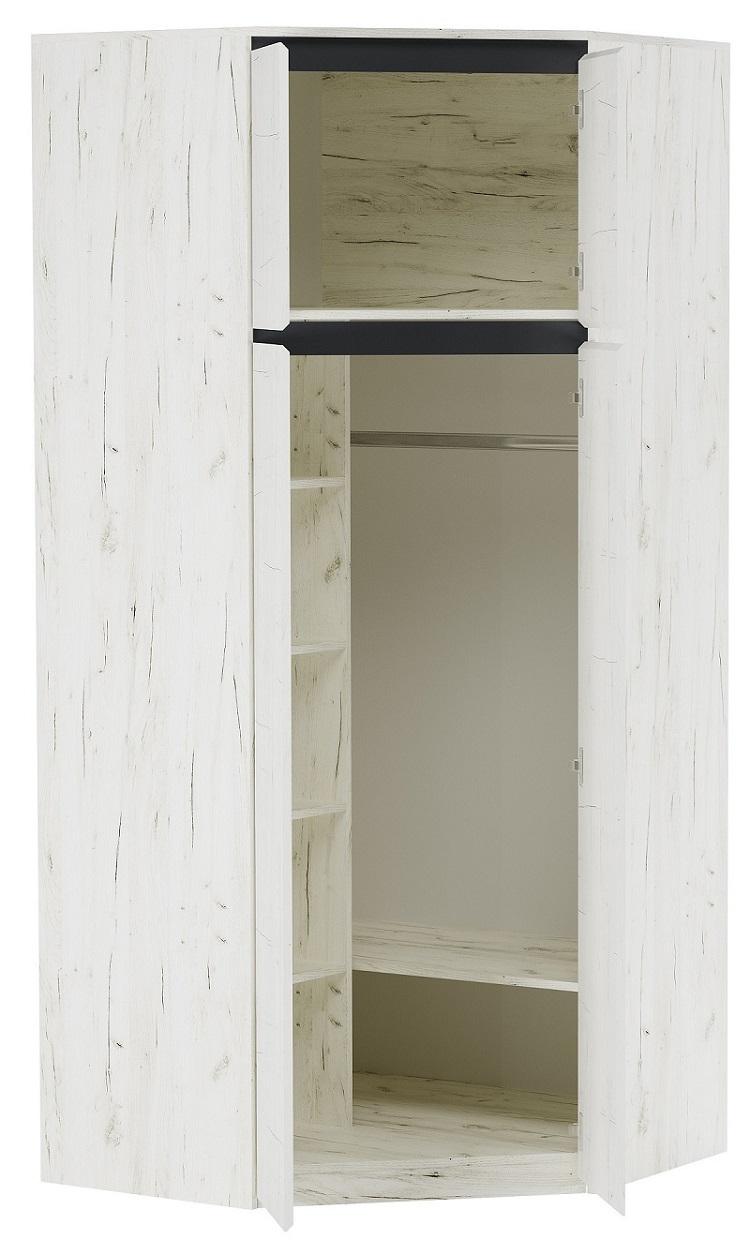 Шкаф угловой «ГРЕТТА» 4-створчатый, с поперечной металлической штангой для верхней одежды, с полками. Применение интегрированной ручки на фасадах делает модель стильной и безопасной – дверцы открываются за профилированные выступы. Фасады обработаны кромкой 1 мм. Чёрная регулируемая ножка-опора.