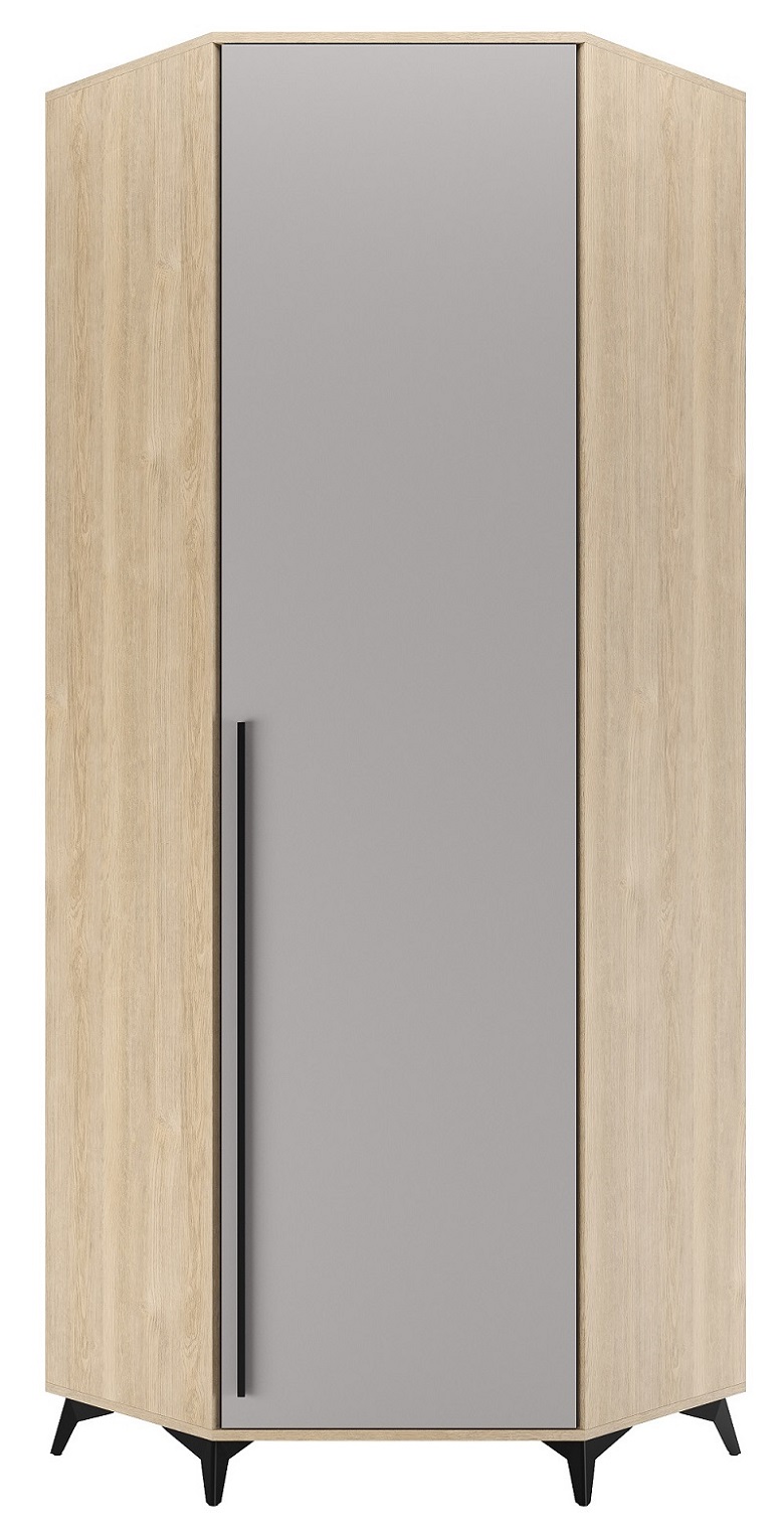 Шкаф угловой 800 1С «ЕВА» с поперечной металлической штангой, с полками. Фасад и лицевой периметр шкафа обработаны кромкой 1 мм. Чёрная металлическая ручка-рейлинг и ножки-опоры.