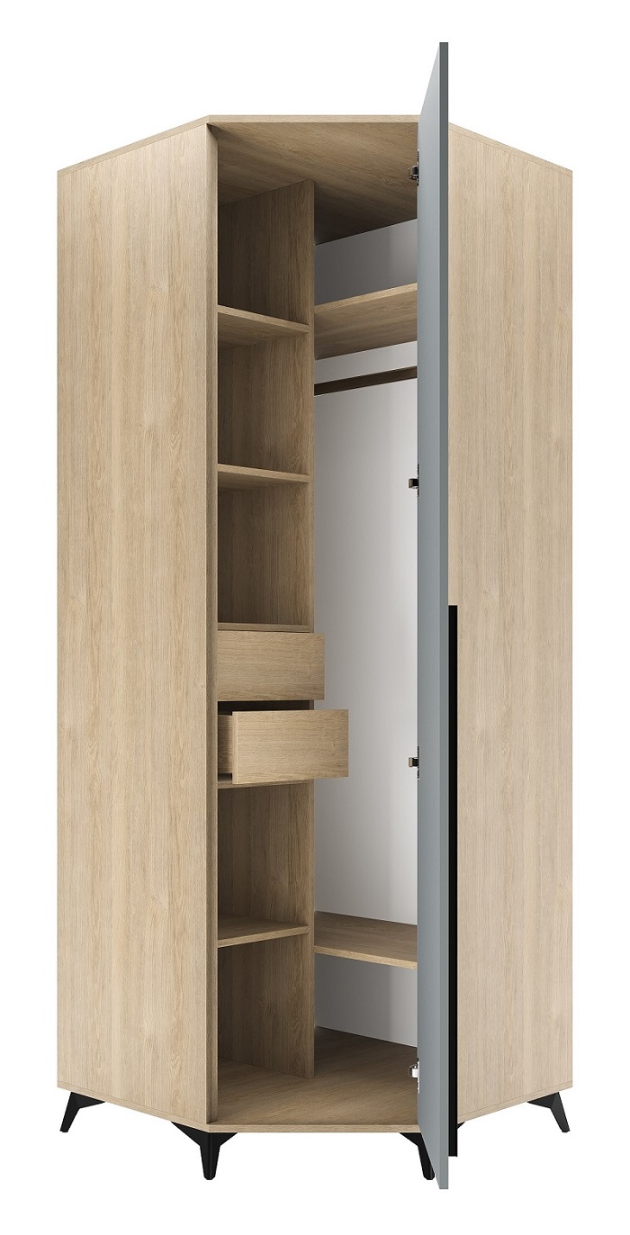 Шкаф угловой 840 1С2Я «ЕВА» с металлической штангой, полками и ящиками на направляющих скрытого монтажа с доводчиками. Фасады и лицевой периметр шкафа обработаны кромкой 1 мм. Чёрные металлические ручки-рейлинги и ножки-опоры.