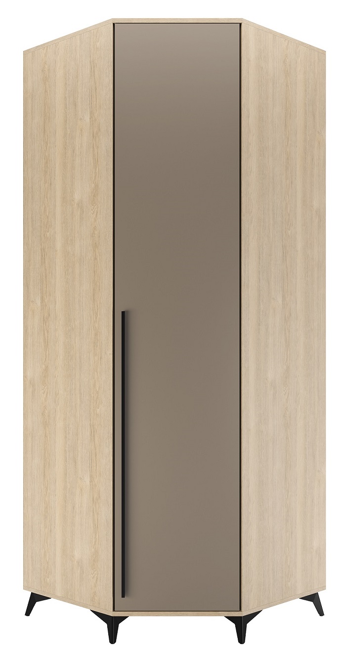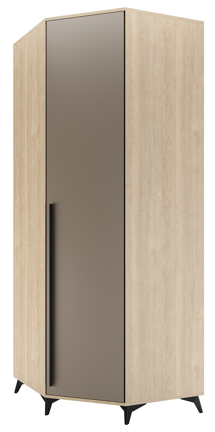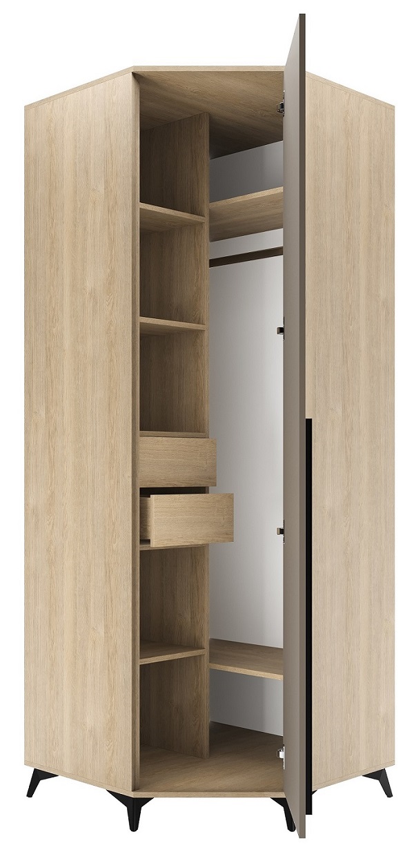 Шкаф угловой 840 1С2Я «ЕВА» с металлической штангой, полками и ящиками на направляющих скрытого монтажа с доводчиками. Фасады и лицевой периметр шкафа обработаны кромкой 1 мм. Чёрные металлические ручки-рейлинги и ножки-опоры.