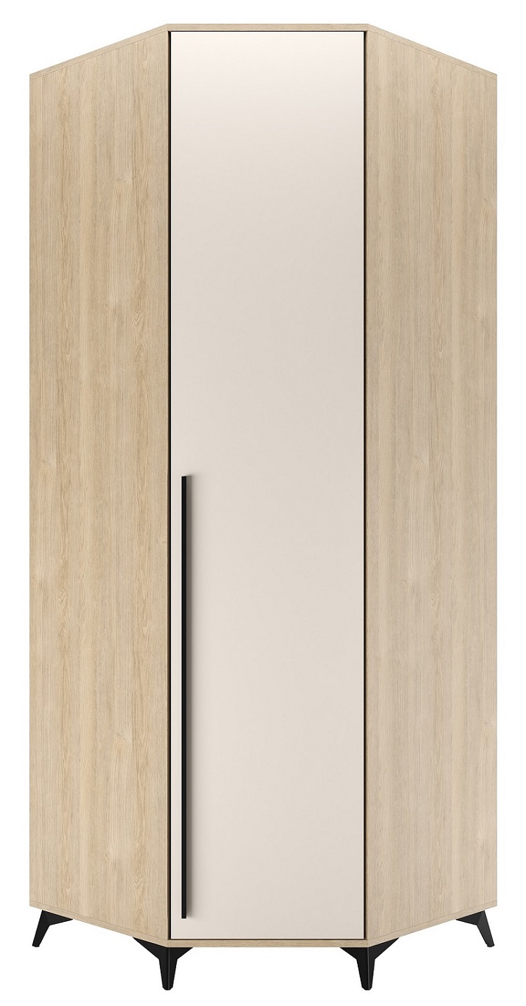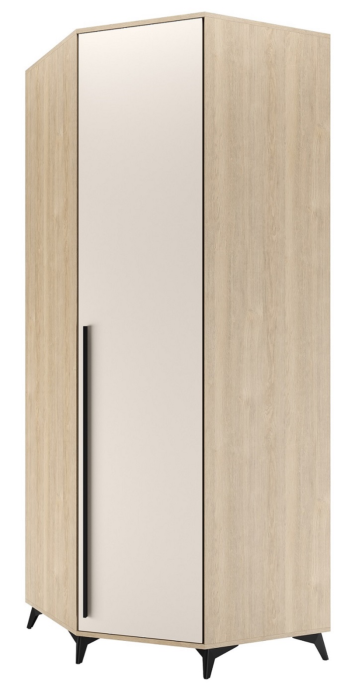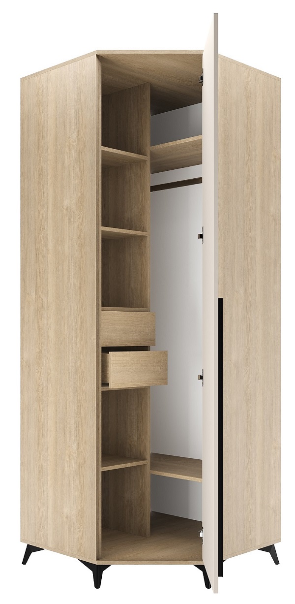 Шкаф угловой 840 1С2Я «ЕВА» с металлической штангой, полками и ящиками на направляющих скрытого монтажа с доводчиками. Фасады и лицевой периметр шкафа обработаны кромкой 1 мм. Чёрные металлические ручки-рейлинги и ножки-опоры.