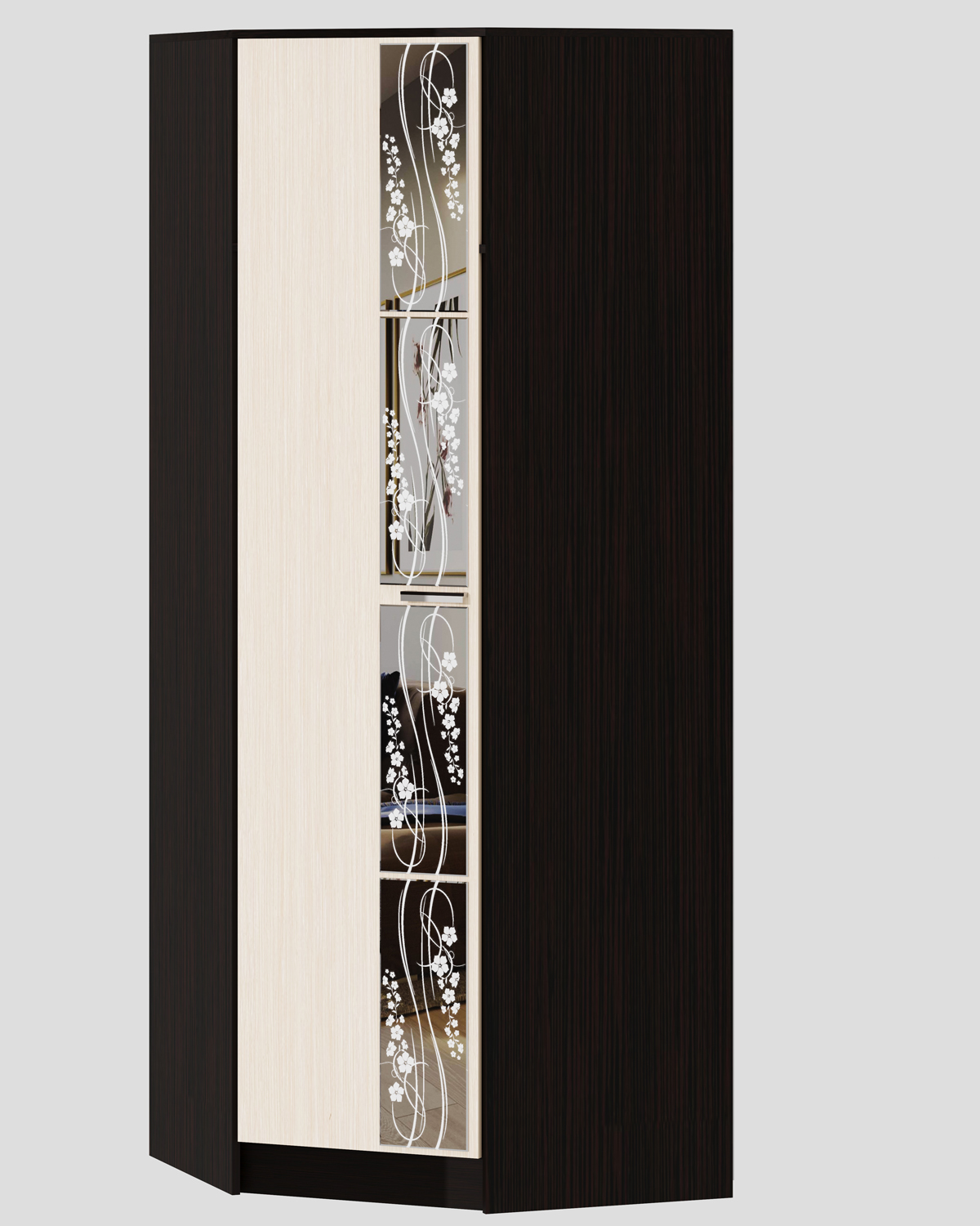 Шкаф угловой СУ-870 «Сабина» с полками и поперечной металлической штангой. Фасад облицован зеркалами с пескоструйным орнаментом, повторяющимся во всех элементах системы.