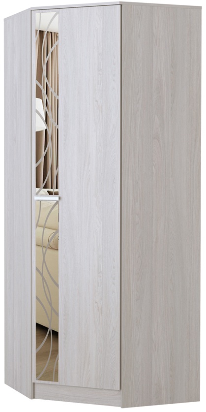 Шкаф угловой СУ-870 «Сабина» с полками и поперечной металлической штангой. Фасад облицован зеркалами с пескоструйным орнаментом, повторяющимся во всех элементах системы.