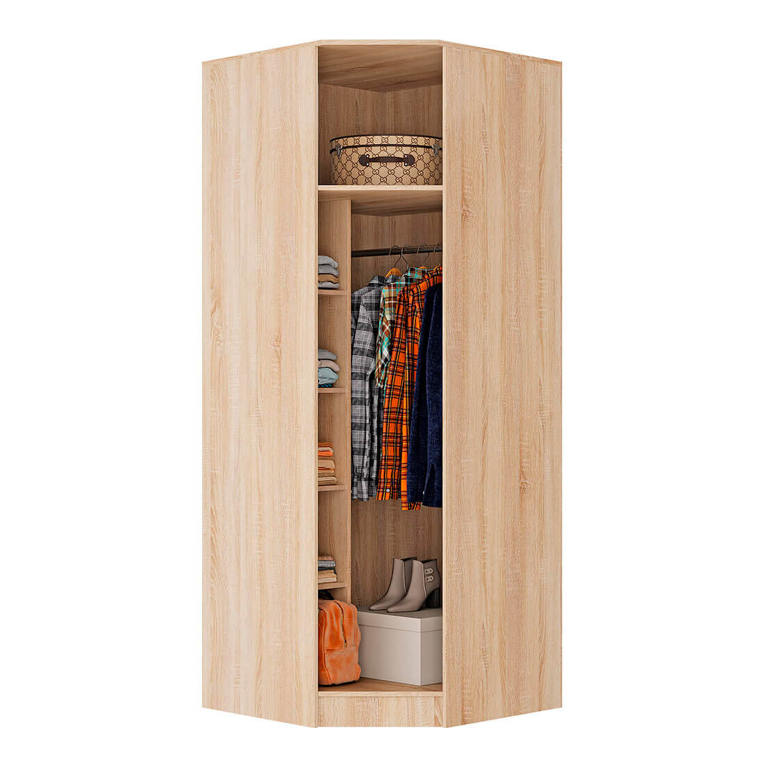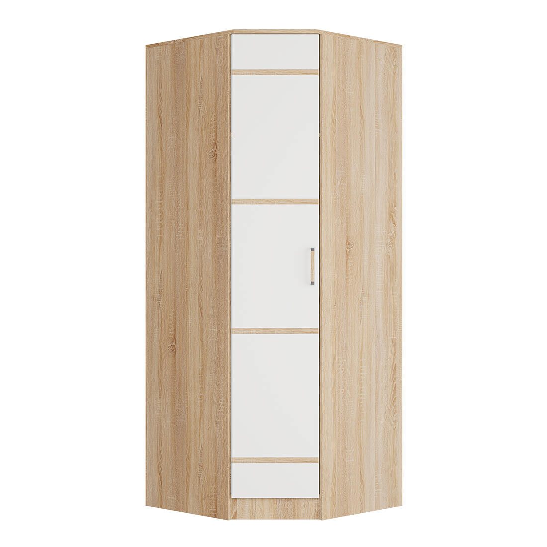 Угловой шкаф Сакура относится к модульной серии мебели и выполнен в одном стиле с другими предметами коллекции. Изделие позволит разместить вам одежду на плечиках в отделении с хромированной штангой, а трикотаж или постельные принадлежности сложить на вместительные полки. Модель изготовлена из ЛДСП в сочетании цветов сонома и белый, будет прекрасно смотреться в интерьере любого стиля.