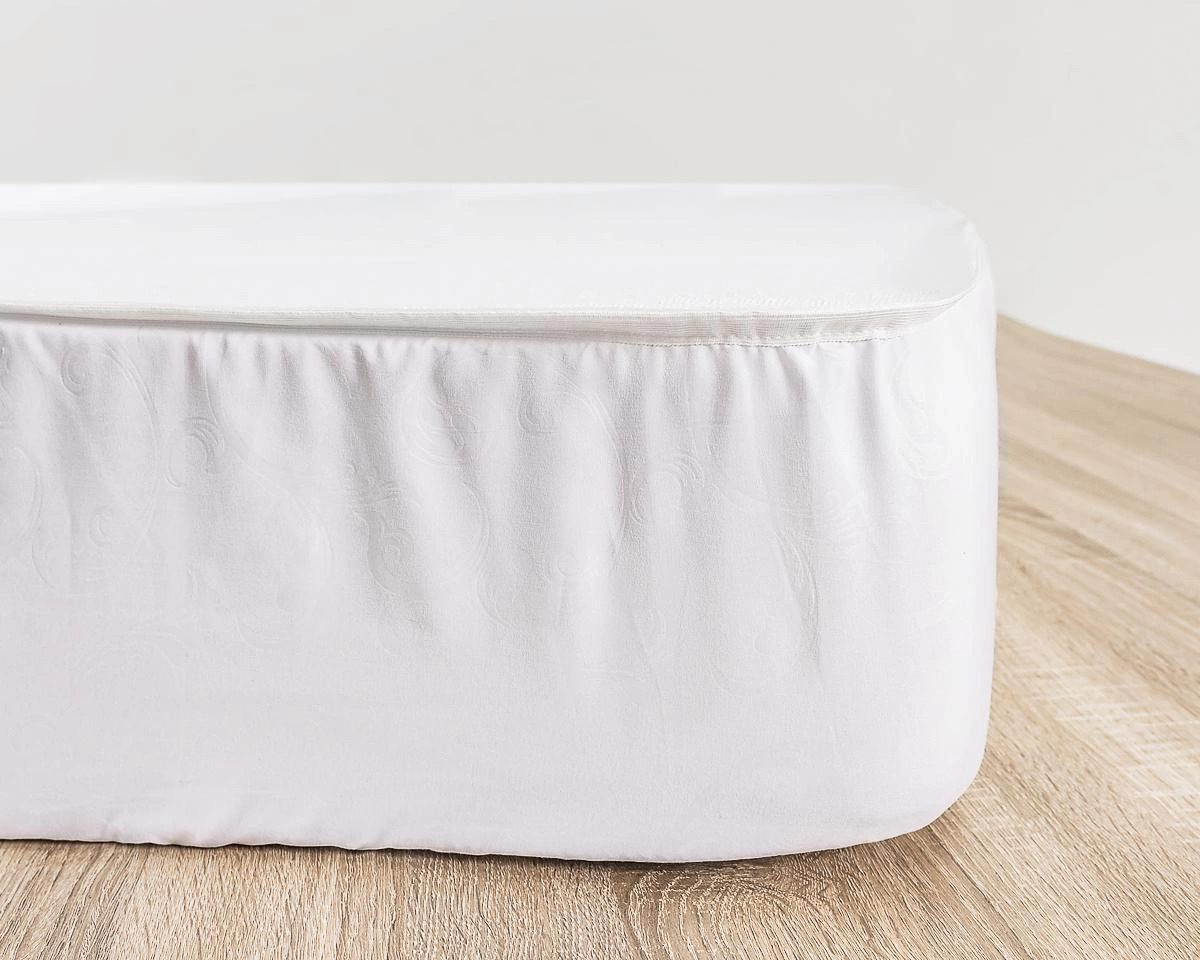 Он защищает не только поверхность, но и бока матраса. Верхняя часть наматрасника изготовлена из махровой ткани на основе водонепроницаемой мембраны. Поэтому поверхность матраса защищена от загрязнений, потертостей и протеканий. Боковая часть чехла изготовлена из микрофибры, этот материал приятен на ощупь и препятствует скольжению постельного белья. Крепление – резинка по периметру борта.