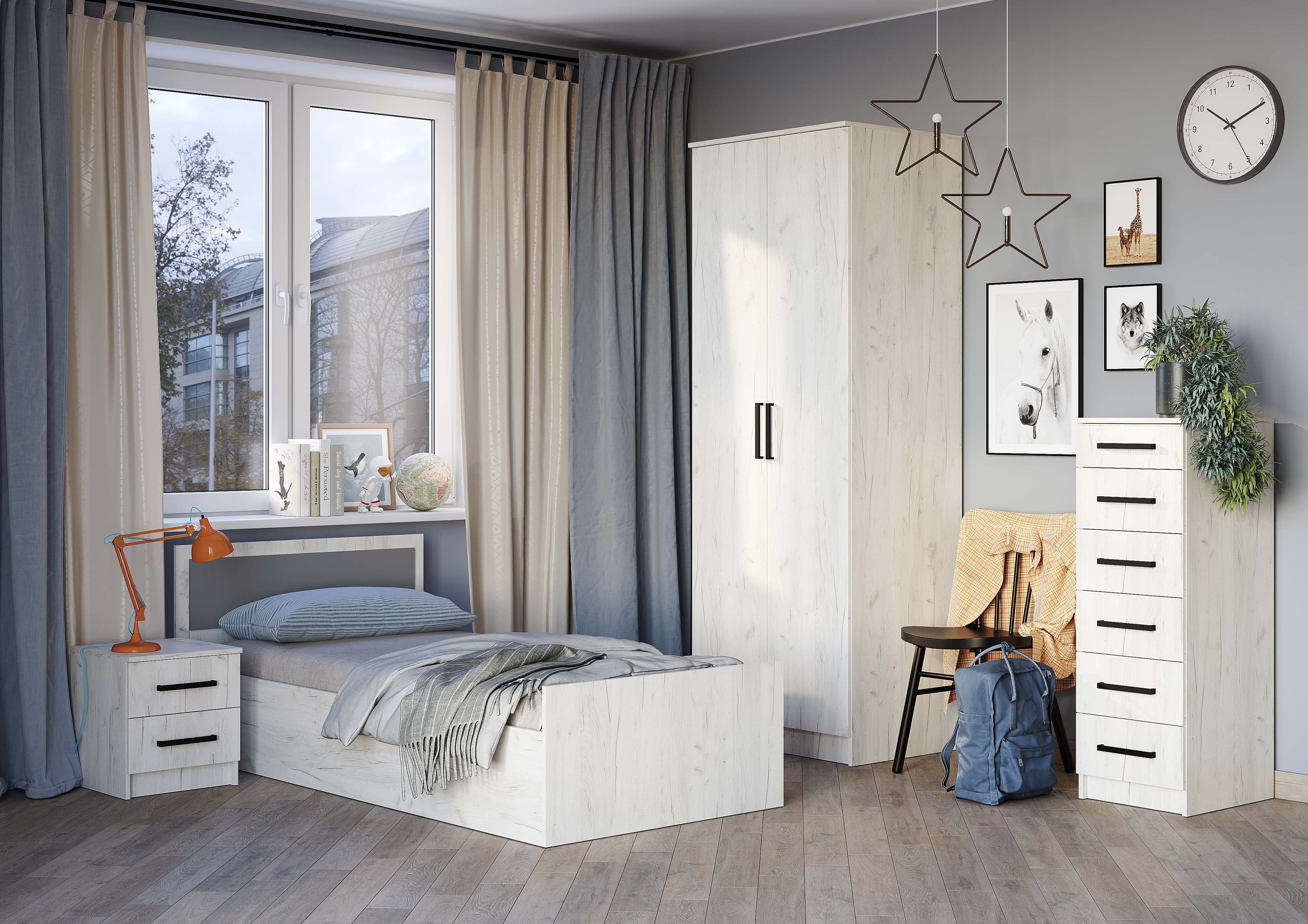 «Фиеста» - это стильная и универсальная коллекция мебели, которая включает в себя все необходимые предметы для обустройства комнаты. Светлый, трендовый оттенок «дуб крафт белый» создает атмосферу легкости и тепла. Накладные ручки контрастного цвета не только облегчают повседневное использование, но и являются стильным акцентом. Изголовье кровати декорировано накладкой в цвете «графит», что придает дополнительную особенность и шарм этой коллекции.