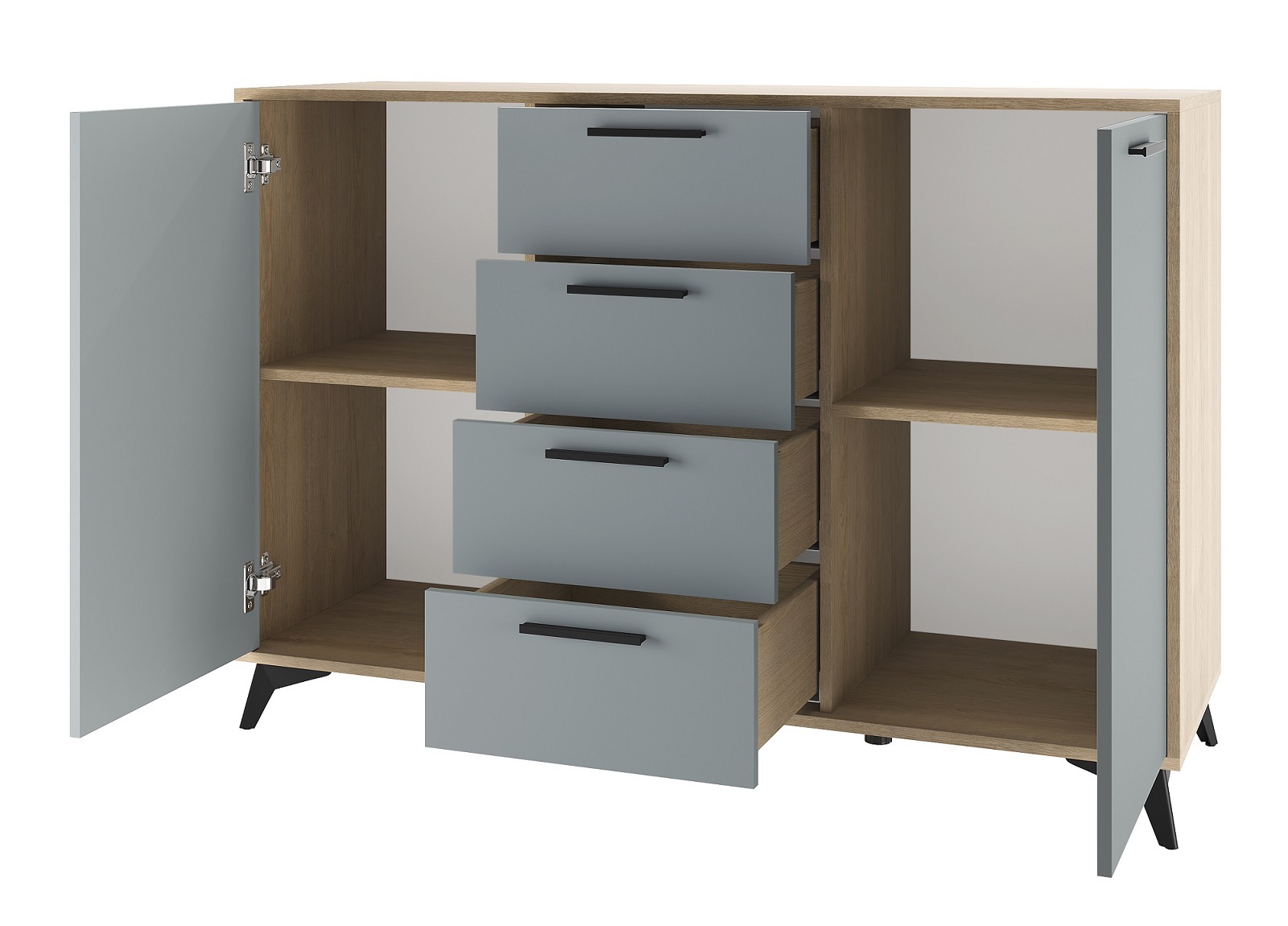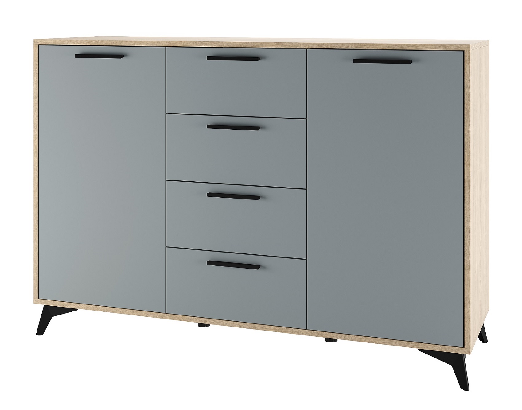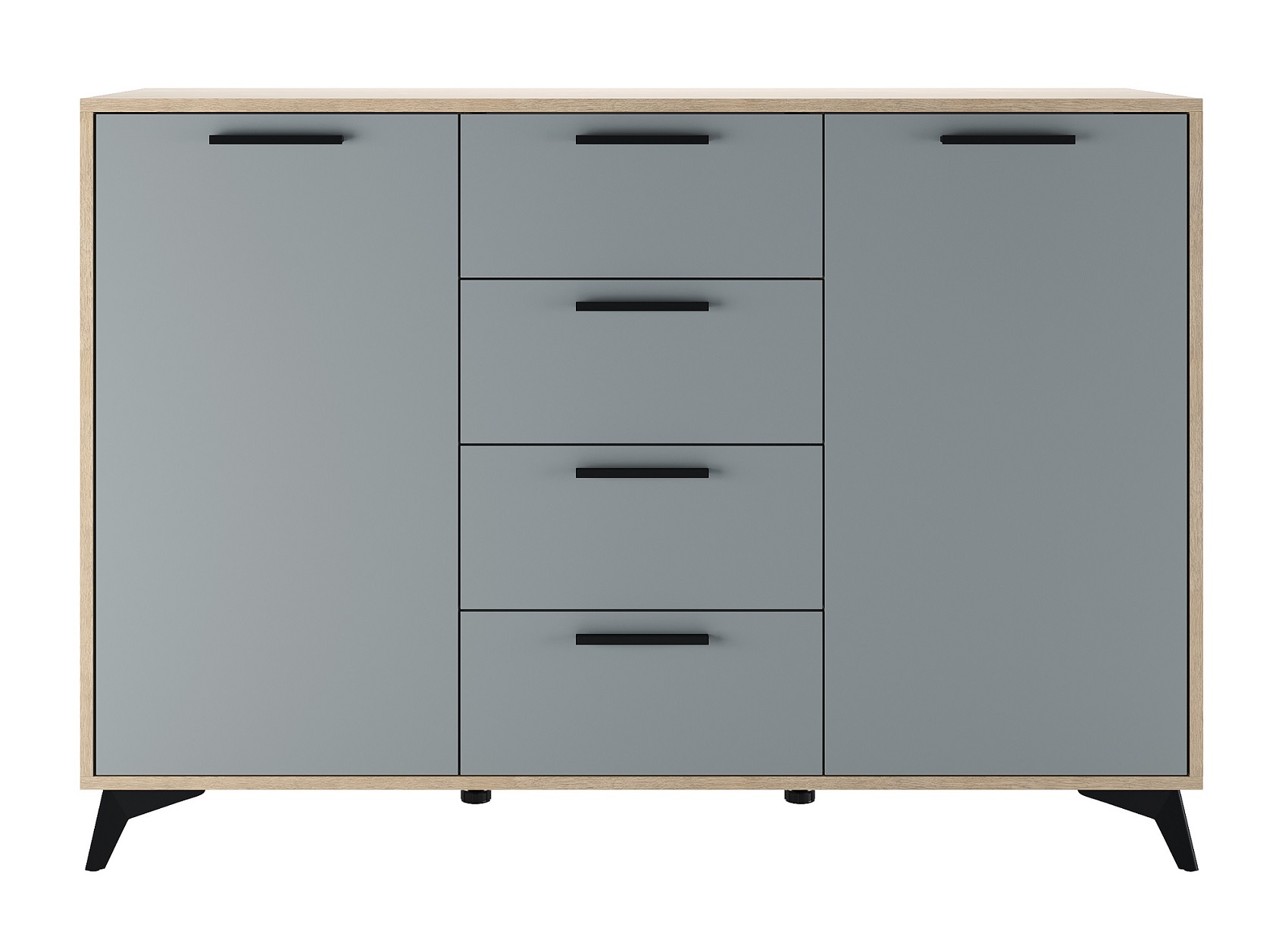 Комод 1360 2С4Я «ЕВА» 2-створчатый с 4-мя ящиками на направляющих скрытого монтажа с доводчиками. Фасады, крышка и лицевой периметр комода обработаны кромкой 1 мм. Чёрные металлические ручки и ножки-опоры.