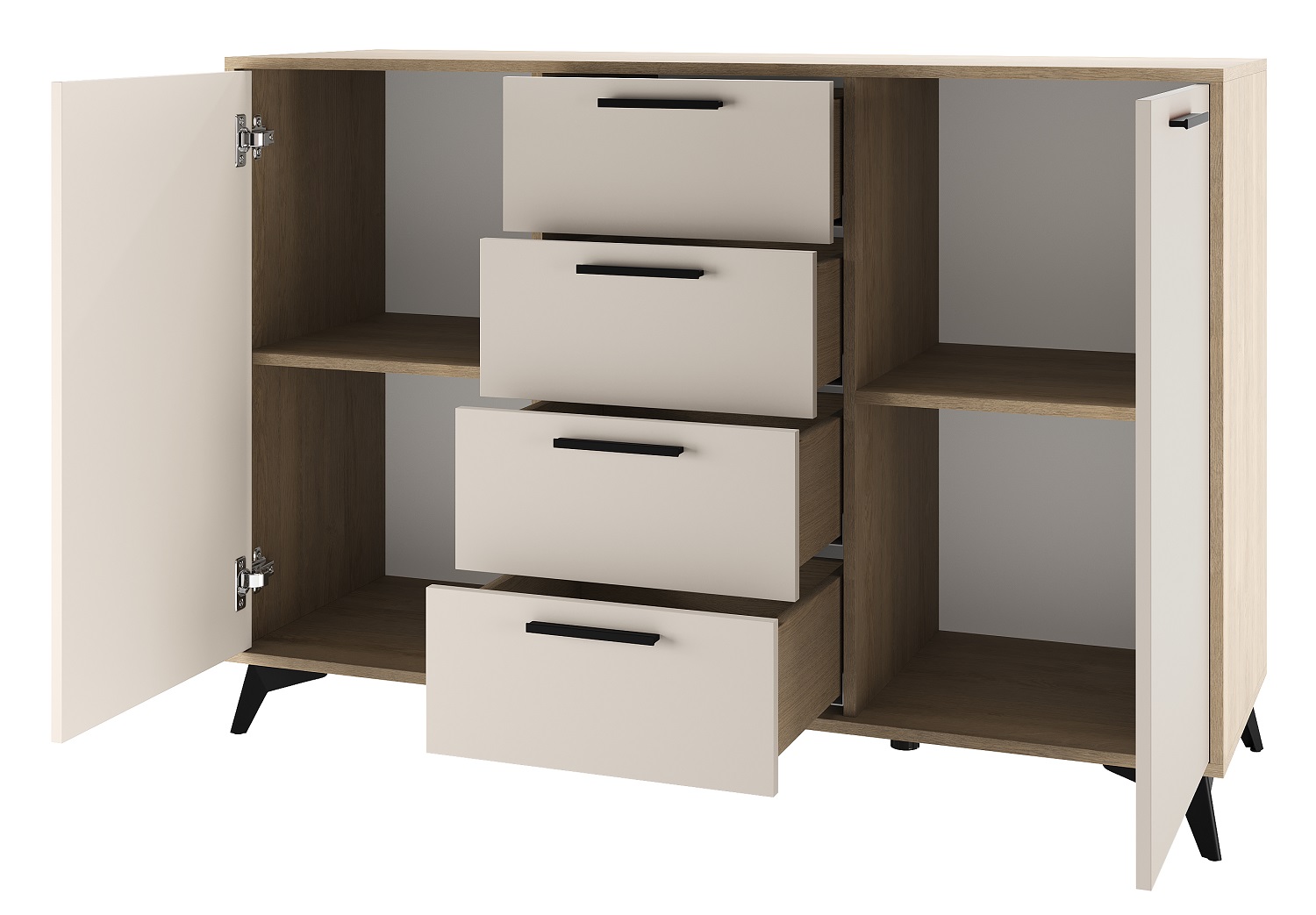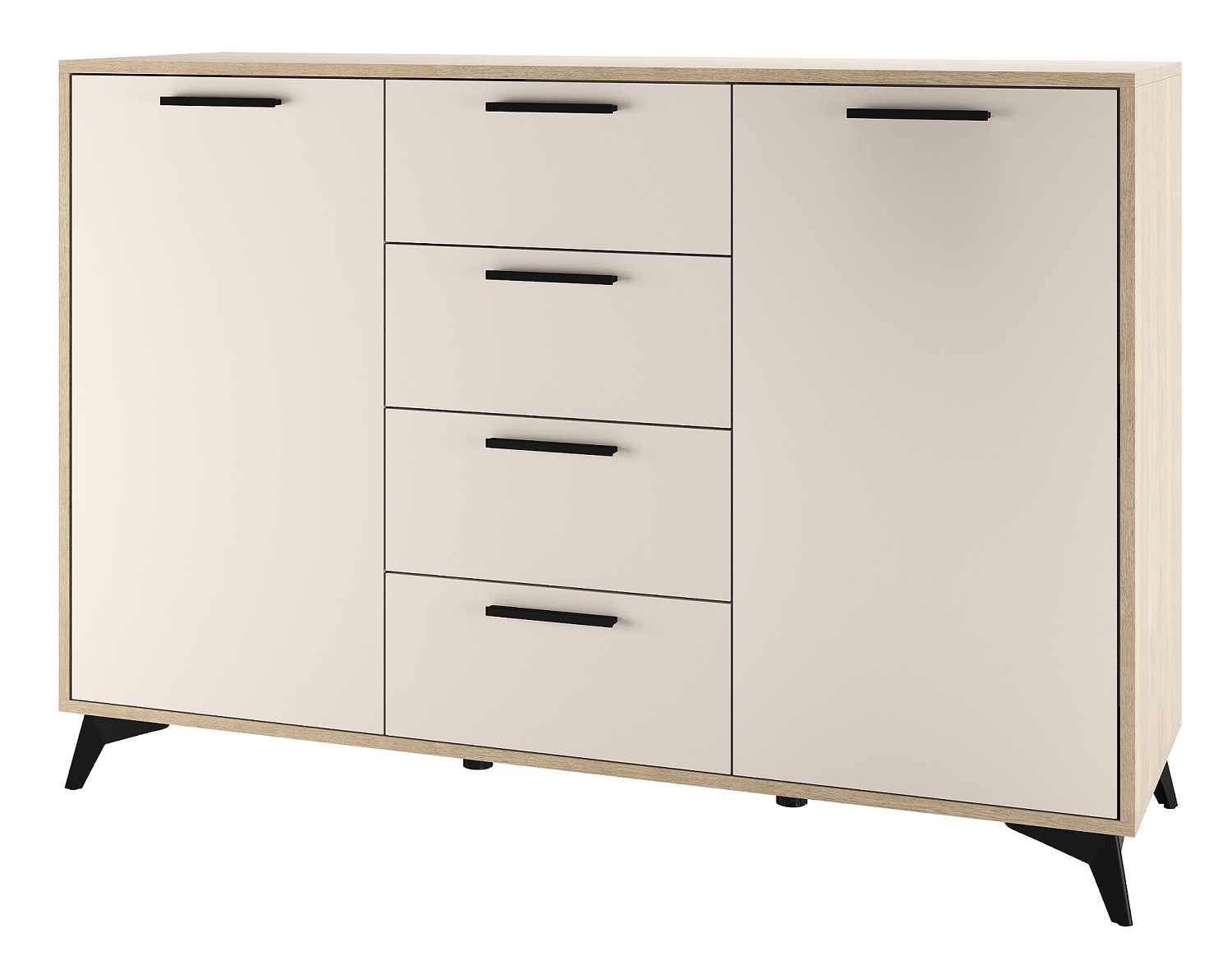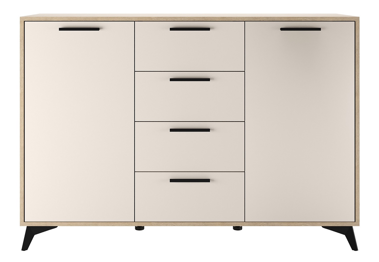 Комод 1360 2С4Я «ЕВА» 2-створчатый с 4-мя ящиками на направляющих скрытого монтажа с доводчиками. Фасады, крышка и лицевой периметр комода обработаны кромкой 1 мм. Чёрные металлические ручки и ножки-опоры.