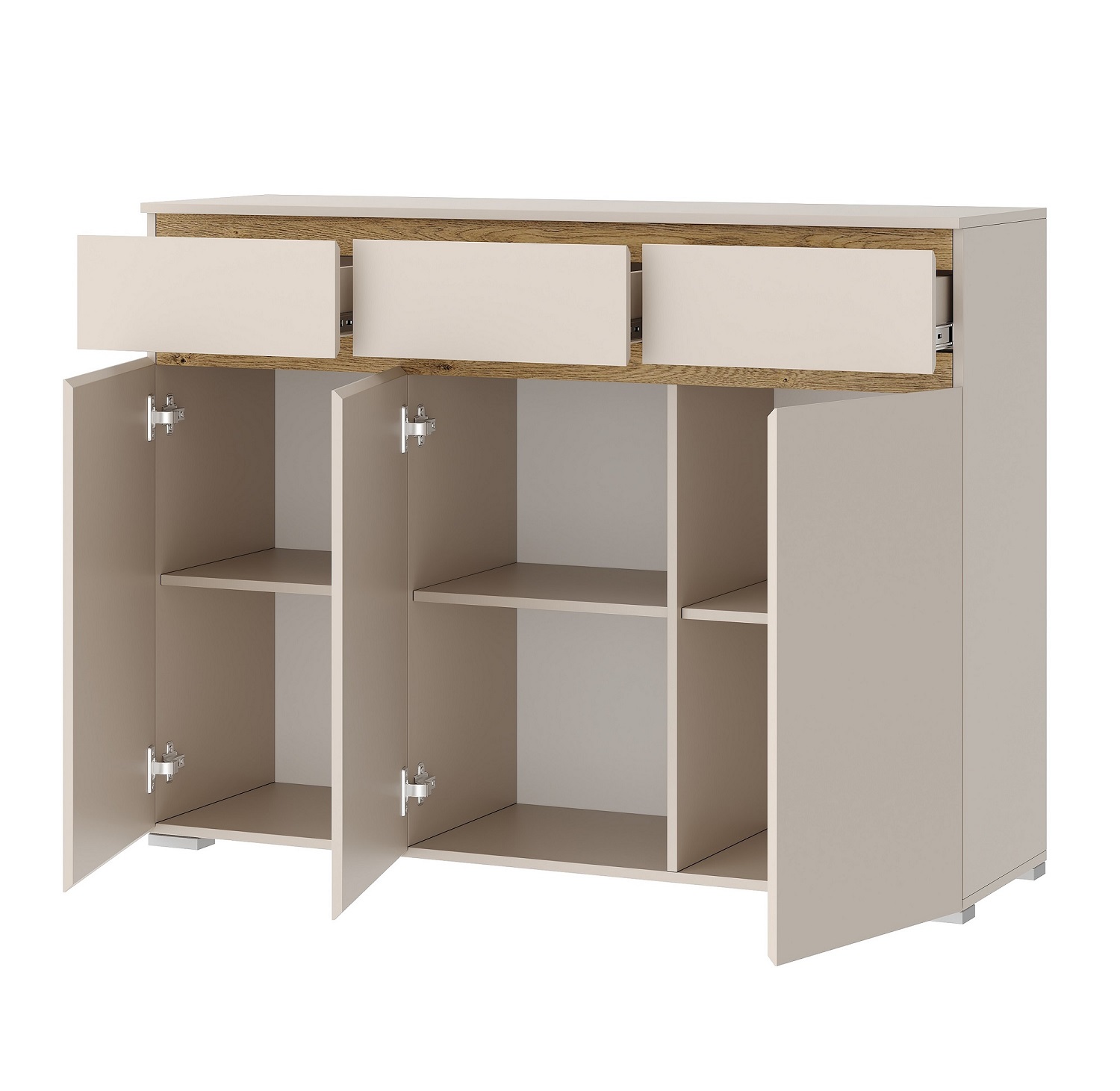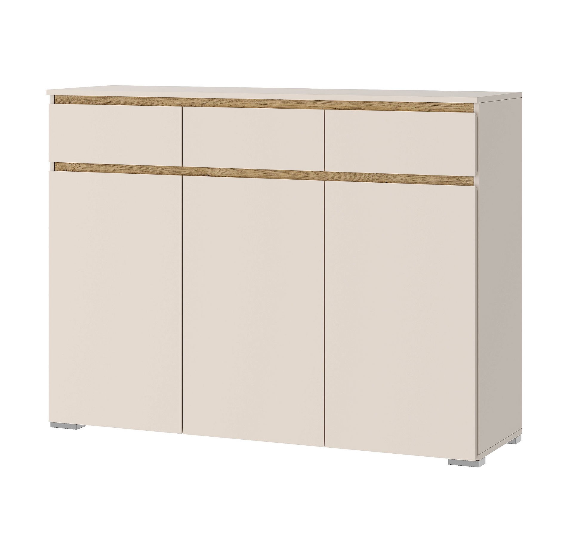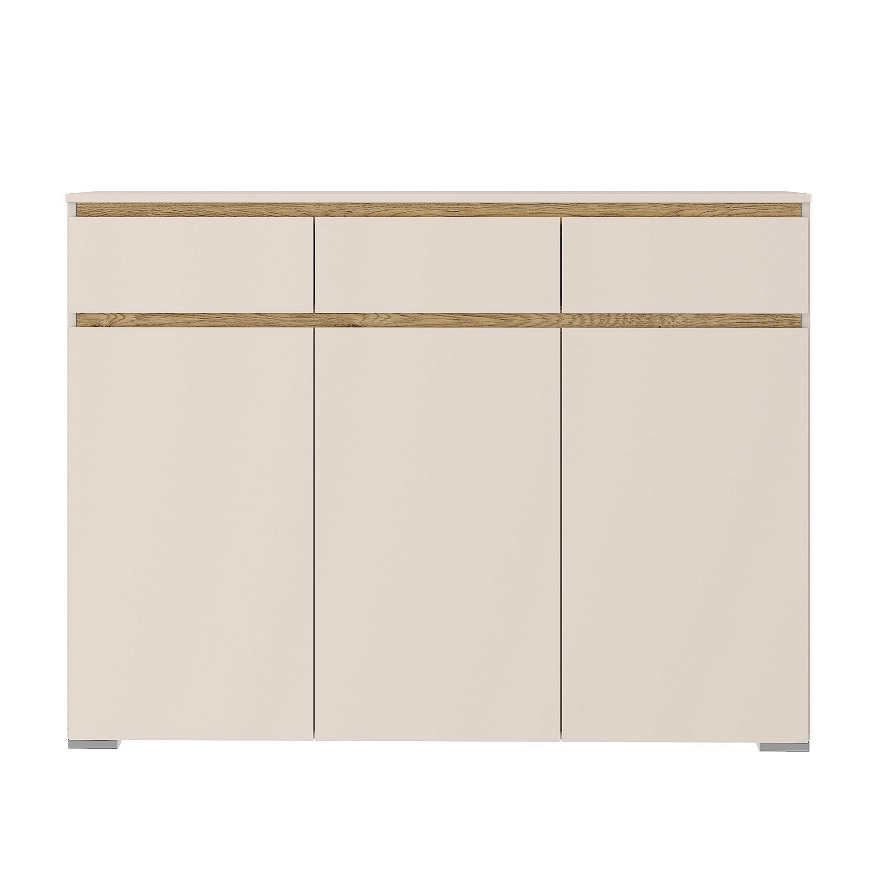 Комод «ГРЕТТА» 3-створчатый с 3-мя ящиками на направляющих полного выдвижения. Применение интегрированной ручки на фасадах делает модель стильной и безопасной – дверцы открываются за профилированные выступы. Фасады обработаны кромкой 1 мм. Серебристая регулируемая ножка-опора.