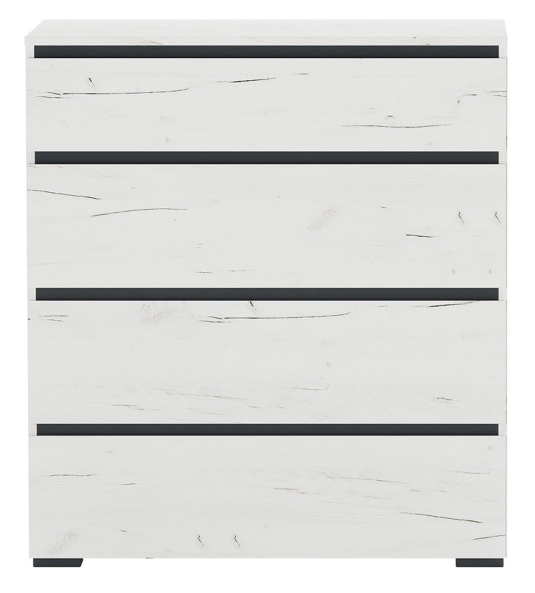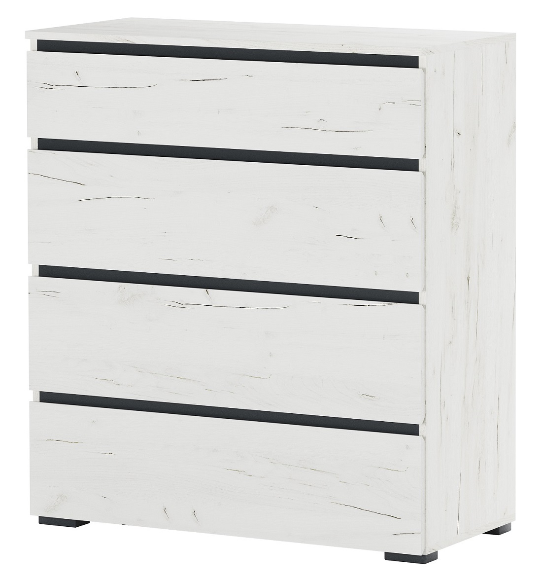 Комод «ГРЕТТА» с 4-мя ящиками на направляющих полного выдвижения. Применение интегрированной ручки на фасадах делает модель стильной и безопасной – дверцы открываются за профилированные выступы. Фасады обработаны кромкой 1 мм. Чёрная регулируемая ножка-опора.