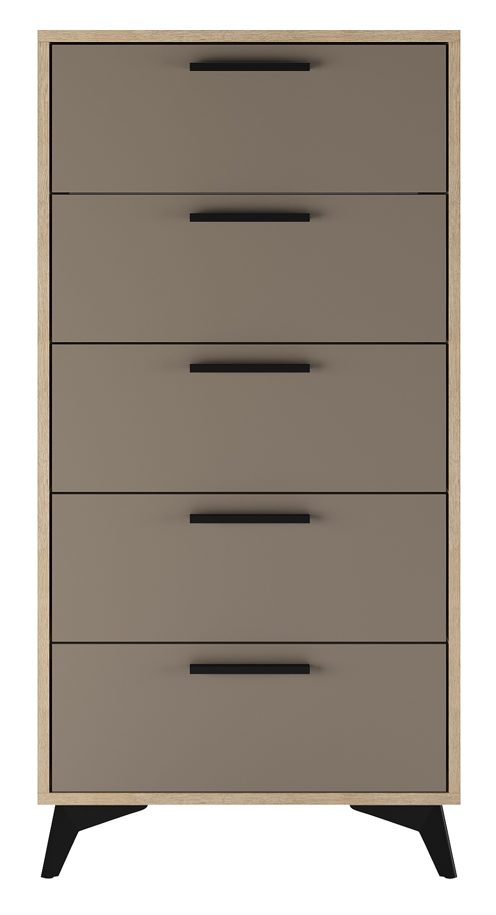 Комод 570 5Я «ЕВА» с 5-ю ящиками на направляющих скрытого монтажа с доводчиками. Фасады, крышка и лицевой периметр комода обработаны кромкой 1 мм. Чёрные металлические ручки и ножки-опоры.
