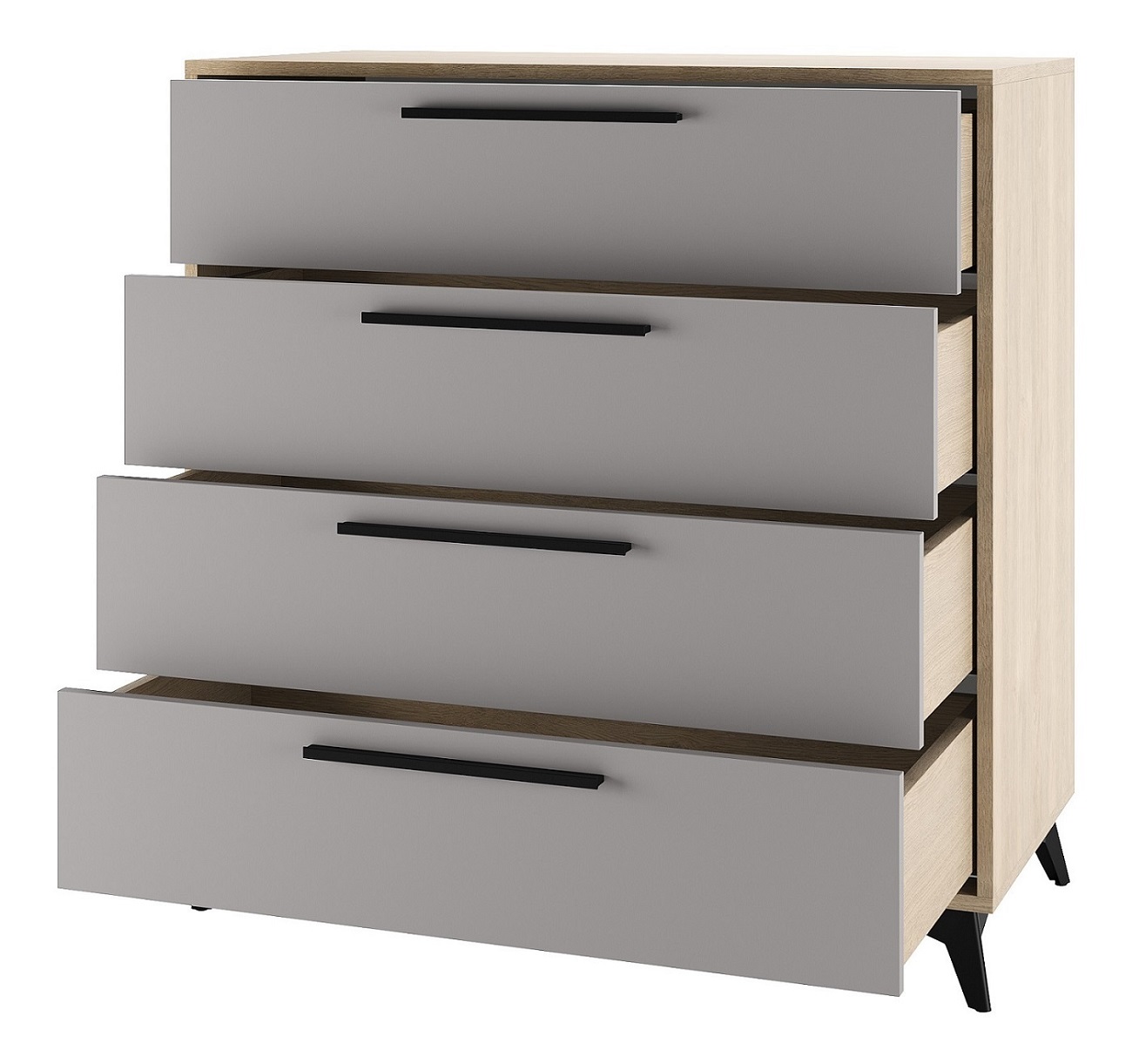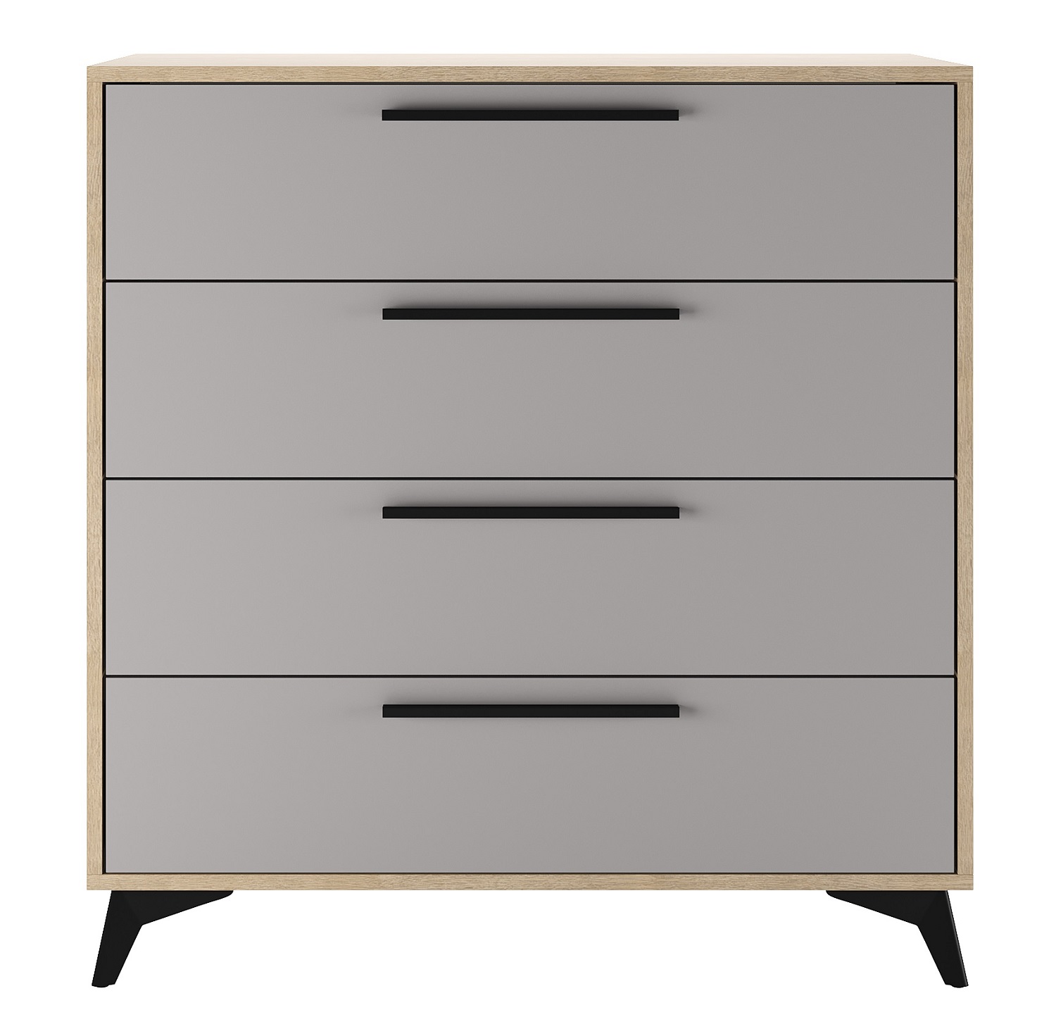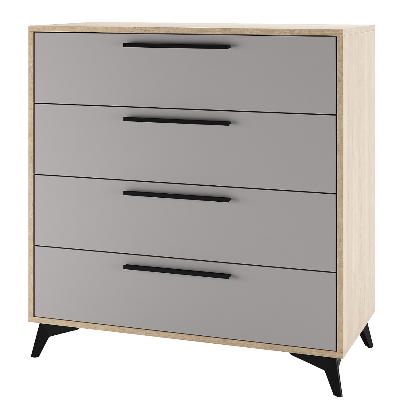 Комод 900 4Я «ЕВА» с 5-мя ящиками на направляющих скрытого монтажа с доводчиками. Фасады, крышка и лицевой периметр комода обработаны кромкой 1 мм. Чёрные металлические ручки и ножки-опоры.