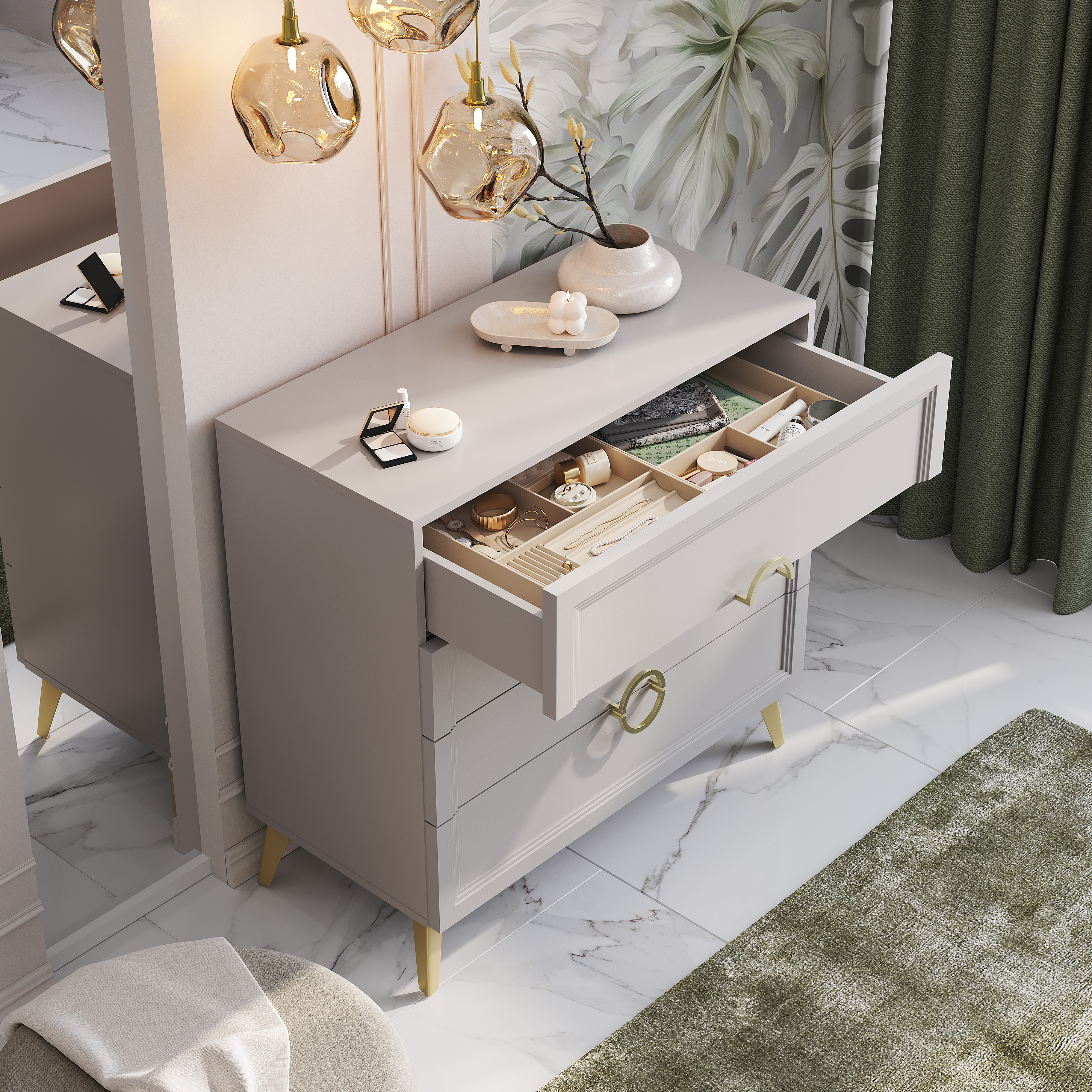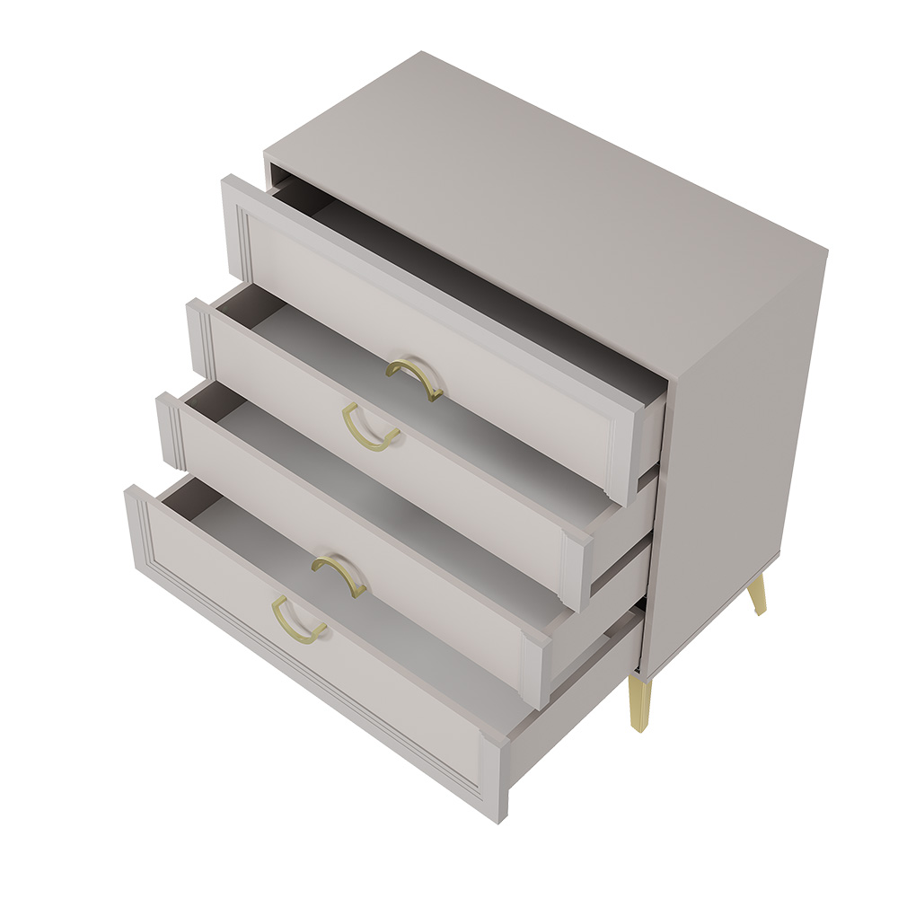 Фасады выполнены из ЛДСП в цвете «кашемир» толщиной 16 мм, а по краям фасады облицованы рамочным профилем из МДФ с рельефной фрезеровкой толщиной 26 мм.