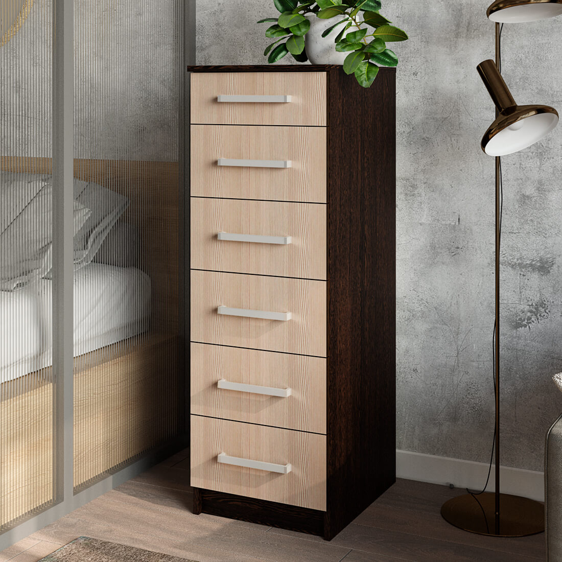 Невероятно практичная и функциональная модель комода «Фиеста» отлично впишется в любую комнату от коридора до спальни. Компактный размер изделия вместит в себя большое количество вещей за счет шести выдвижных ящиков. Верхнее отделение меньше остальных и прекрасно подходит для хранения мелочей. Комод «Фиеста» выполнен из ЛДСП высокого качества в контрастных цветах «венге» и «лоредо».