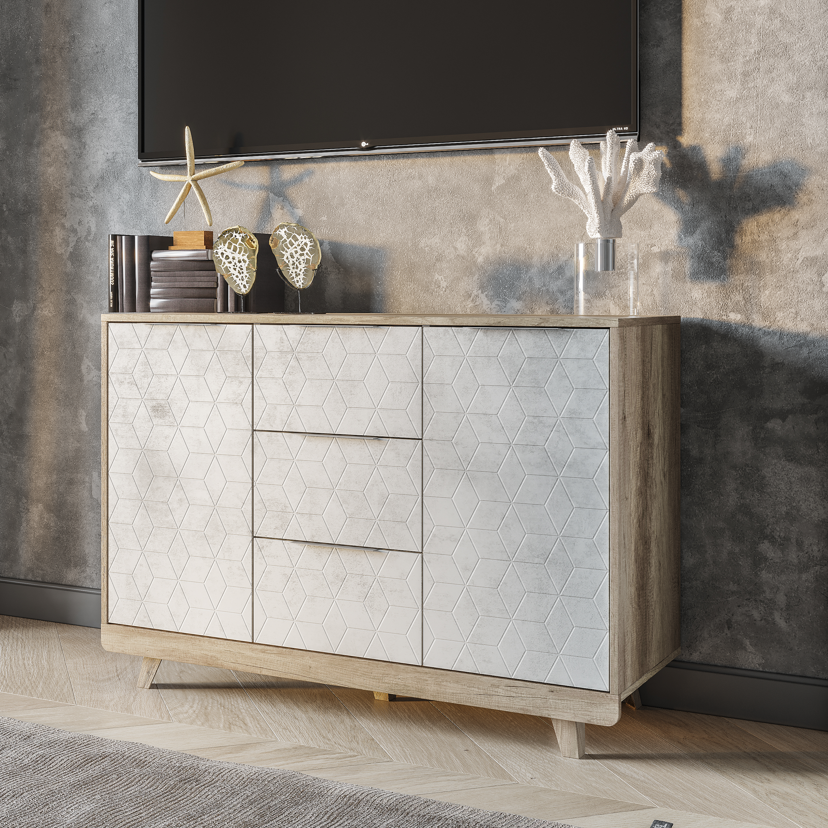 Особый шарм комодам «Мегаполис» придают трендовые цветовые решения фасадов, которые идеально вписываются практически в любой стиль. Оригинальная фрезеровка и эксклюзивная фотопечать выглядит очень эффектно и эксклюзивно. Пыли и грязи на таких поверхностях совершенно не видно, а это огромный плюс для домохозяек! Комод (КМ-15) выдержан в общей стилистике «Мегаполис» и состоит из двух распашных по бокам и трёх выдвижных по центру вместительных ящиков на шариковых направляющих с удобной системой хранения. Полезное пространство распашных ящиков разделены полками.
