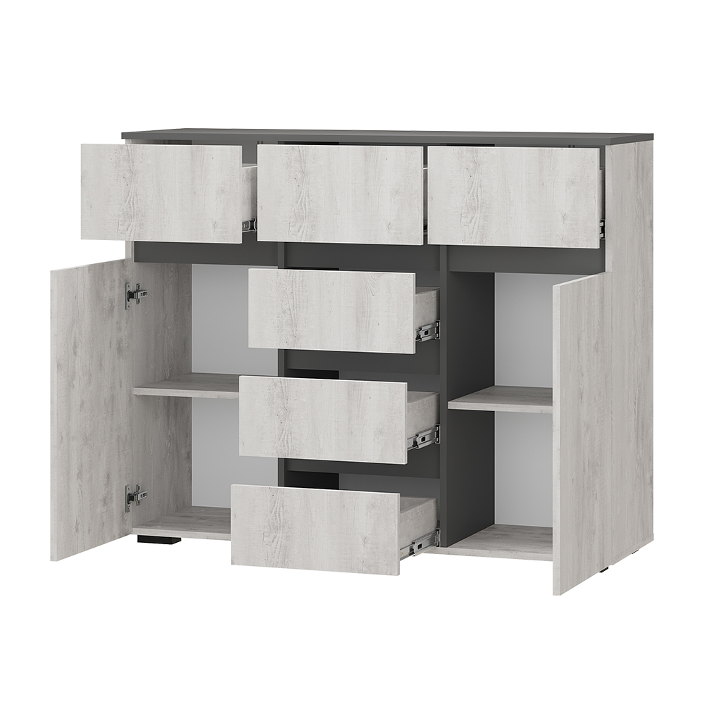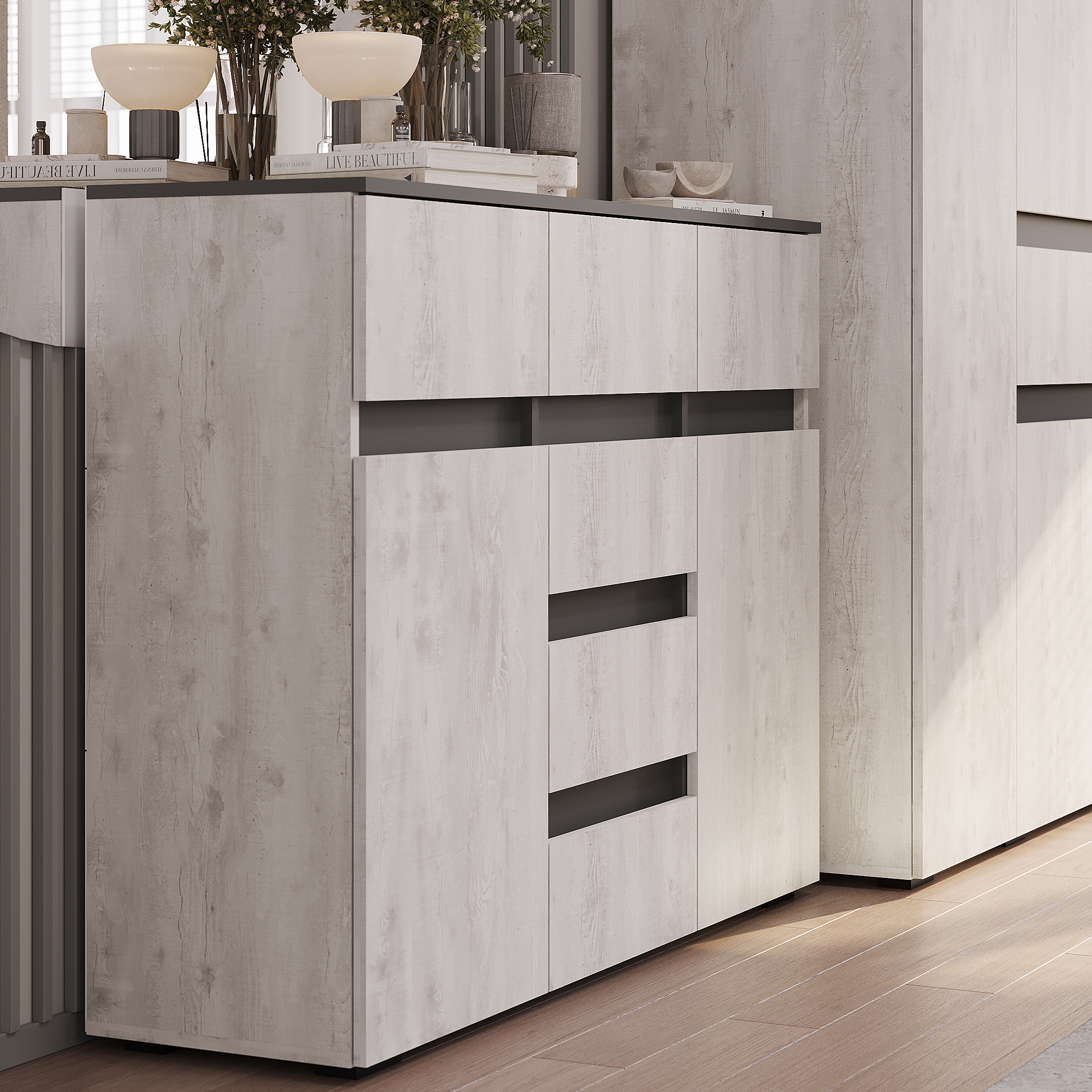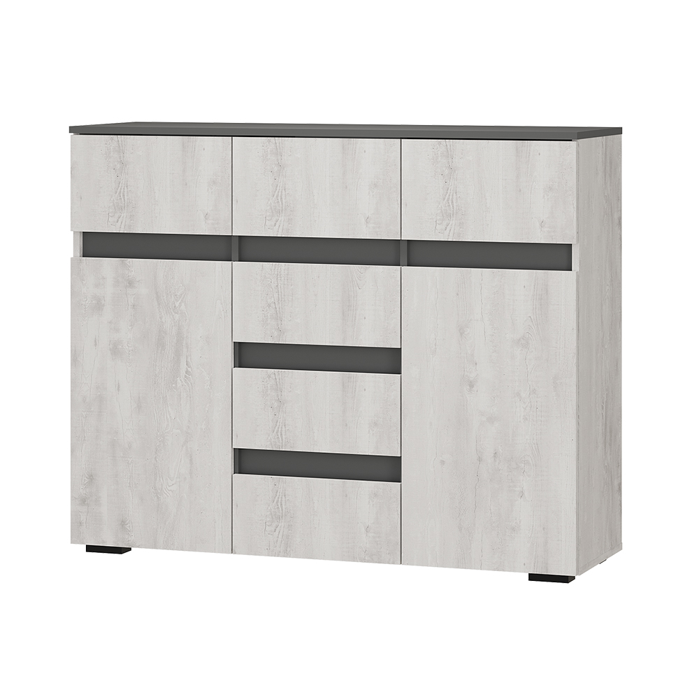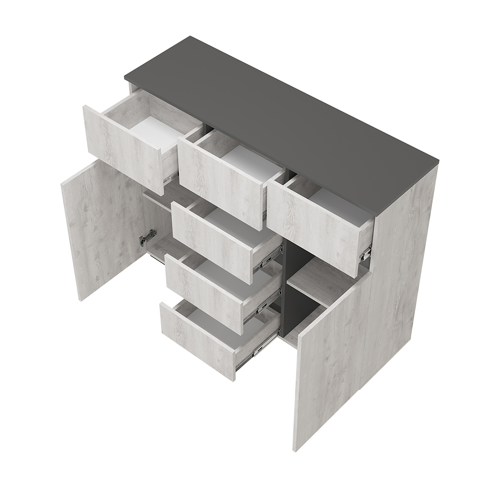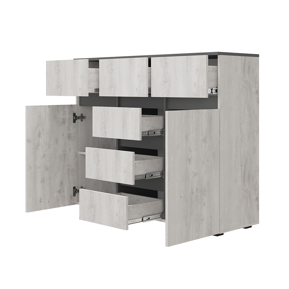 Коллекция «Мрия» — это органичное сочетание классических и современных элементов в дизайне мебели. Оттенки «бетон пайн светлый» и «графит» создают красивый контраст, который привнесет гармонию в интерьер. Однотонные горизонтальные геометрические вставки придают многослойность коллекции.