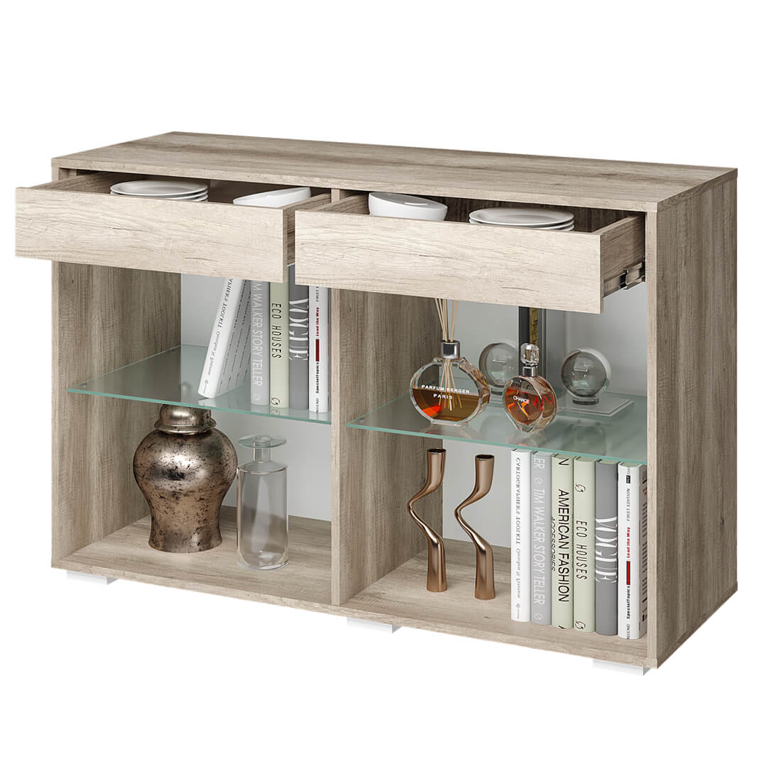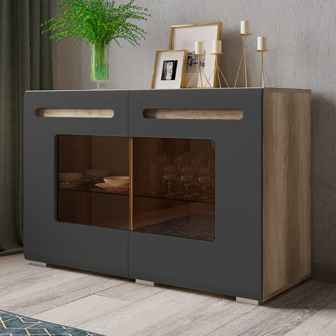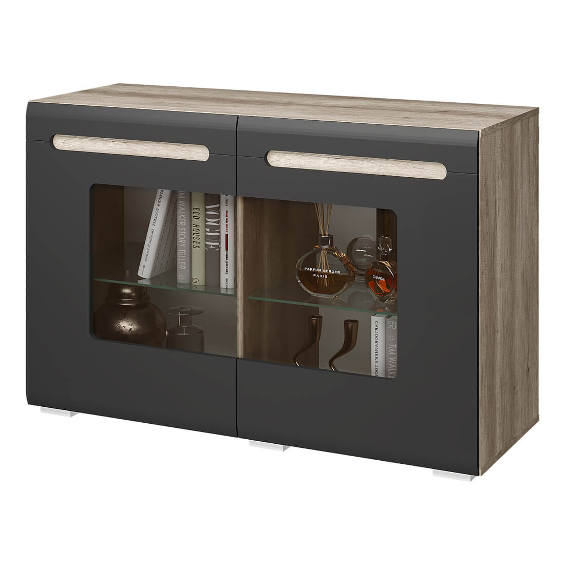 Большой комод «Наоми», выполненный в цвете «дуб каньон» с темными фасадами, может стать привлекательным акцентом любой комнаты. За двумя распашными дверцами, в которые встроены тонированные стекла, расположены полки для хранения посуды или сувениров. А в верхние выдвижные ящики можно положить какие-то мелочи, аксессуары или документы.