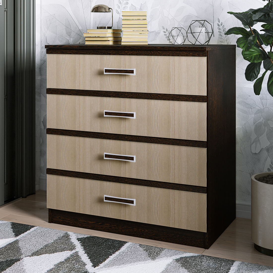 классический комод Сакура состоит из четырех выдвижных ящиков, каждый из которых имеет светлый фасад и эргономичную ручку с хромированной отделкой,