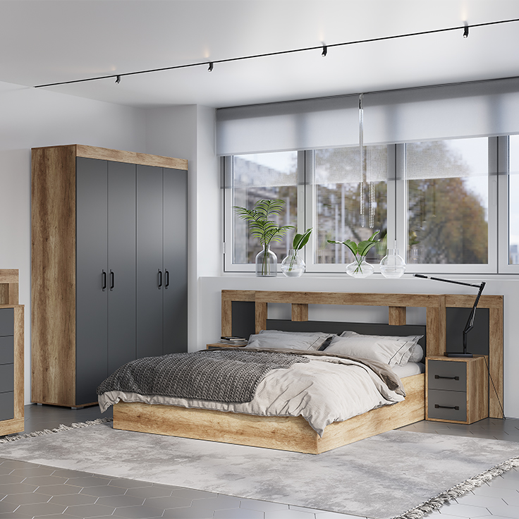 Коллекция «Прима» в модном декоре «дуб каньон/графит» удачно вписывается в городской индустриальный стиль и выглядит очень необычно и оригинально. Приятный корпус под дерево и матовые тёмные фасады - такое сочетание добавит комнате стиля.