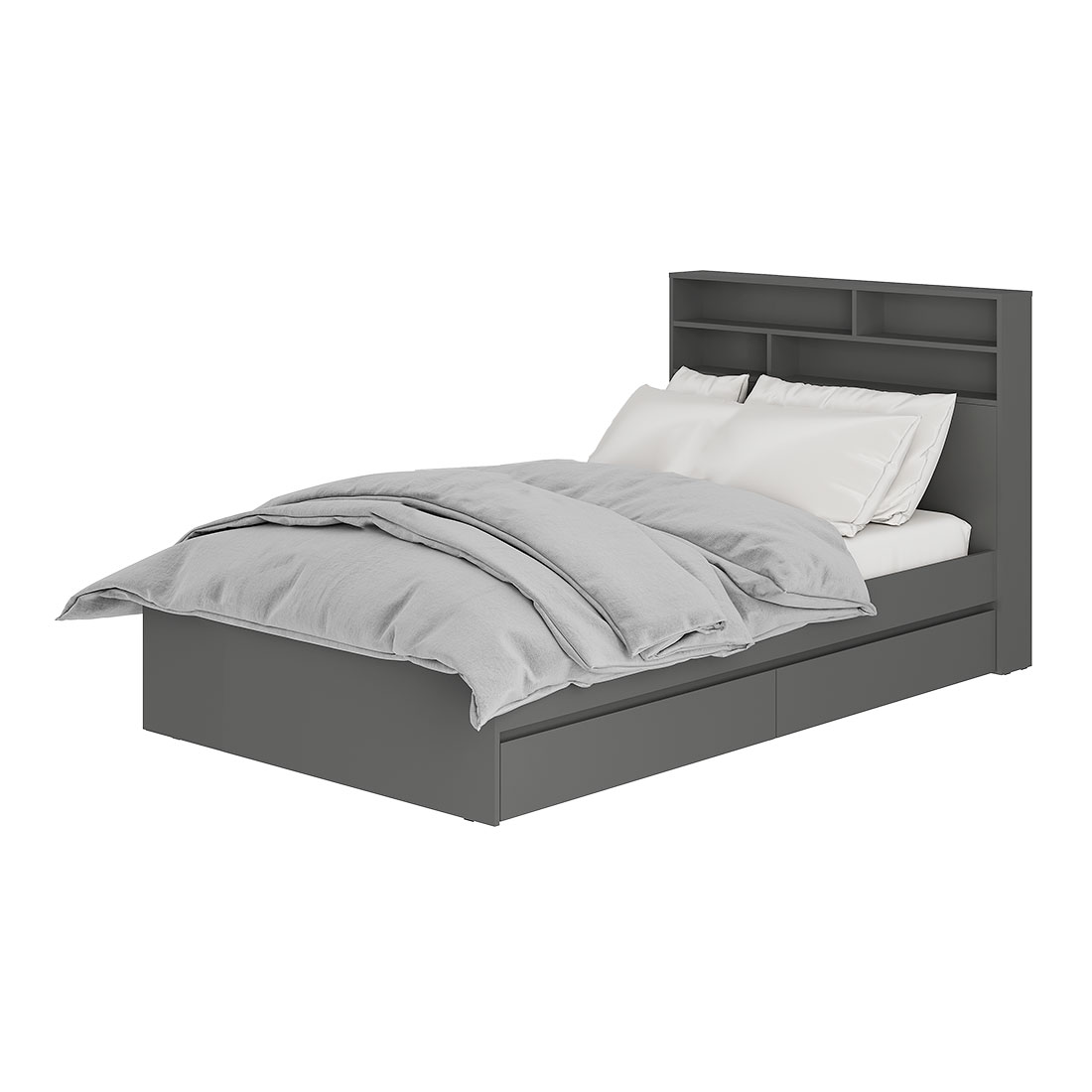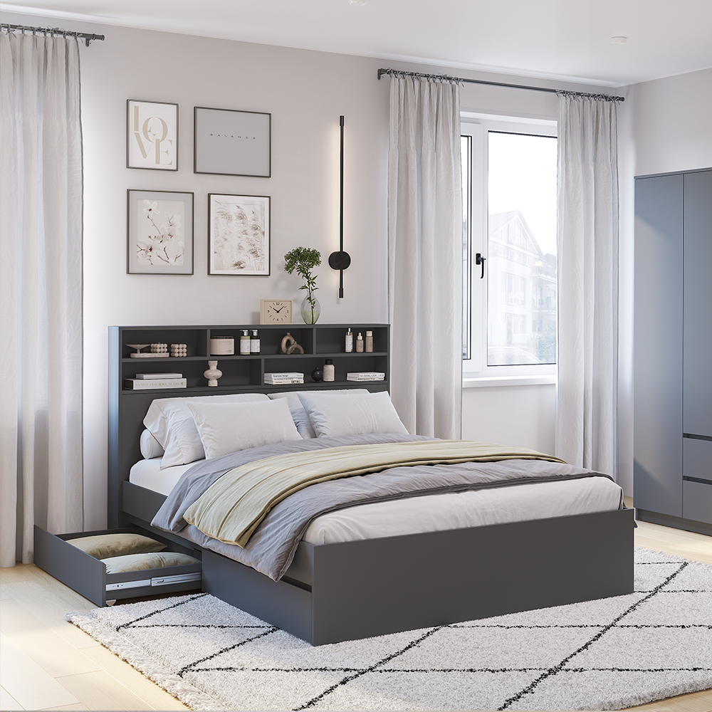 Основание для кровати приобретается отдельно, на выбор: настил ЛДСП с кромкой, реечный настил. Кровать оснащена выкатными ящиками, в которых легко размещается постельное белье, текстиль и другие вещи, которым не нашлось места в шкафу.