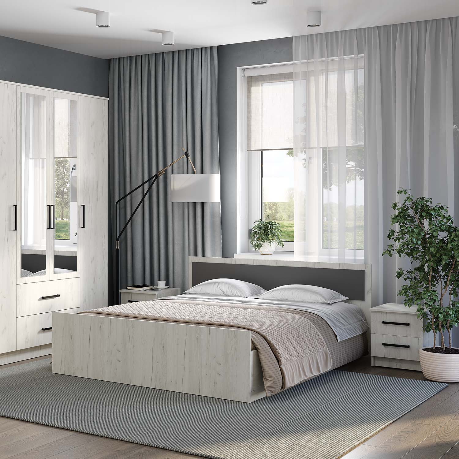 Двуспальная кровать «Фиеста» выполнена из высококачественной ЛДСП в декоре «дуб крафт белый». Изголовье - ЛДСП цвета «графит» 16 мм. Отсутствие ножек избавит вас от скопления пыли под кроватью.