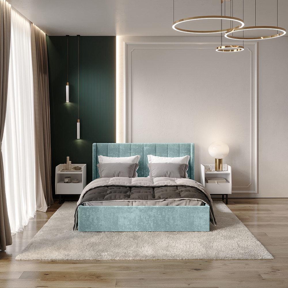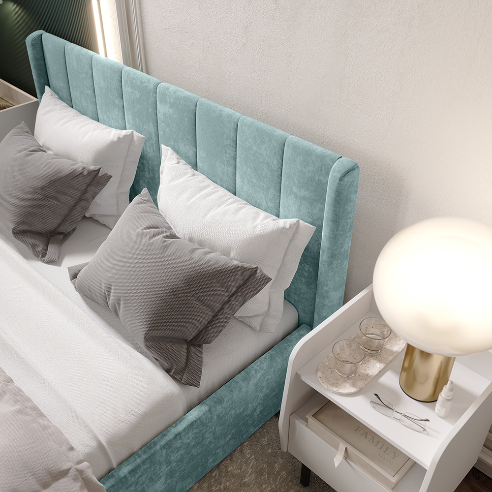 Материал мягких частей - велюр, задняя сторона - спанбонд серый. Декор изголовья - стежка.