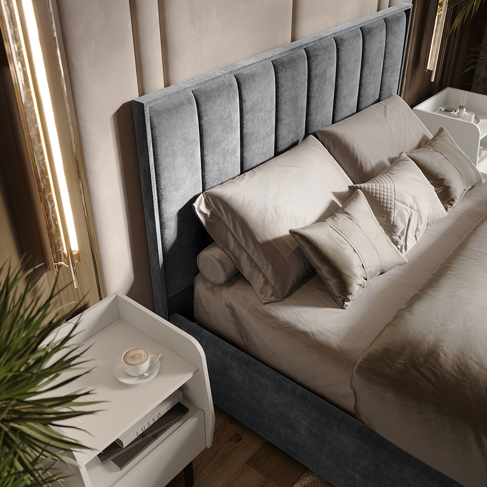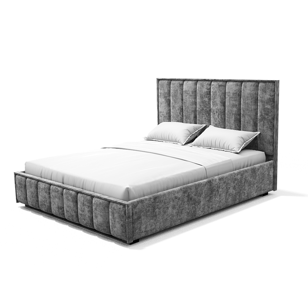Изголовье, царги и изножье - это мягкие части кровати. Изголовье и изножье оформлены мягкими накладками, расцветка соответвует варианту исполнения. Ткань обивки - велюр.